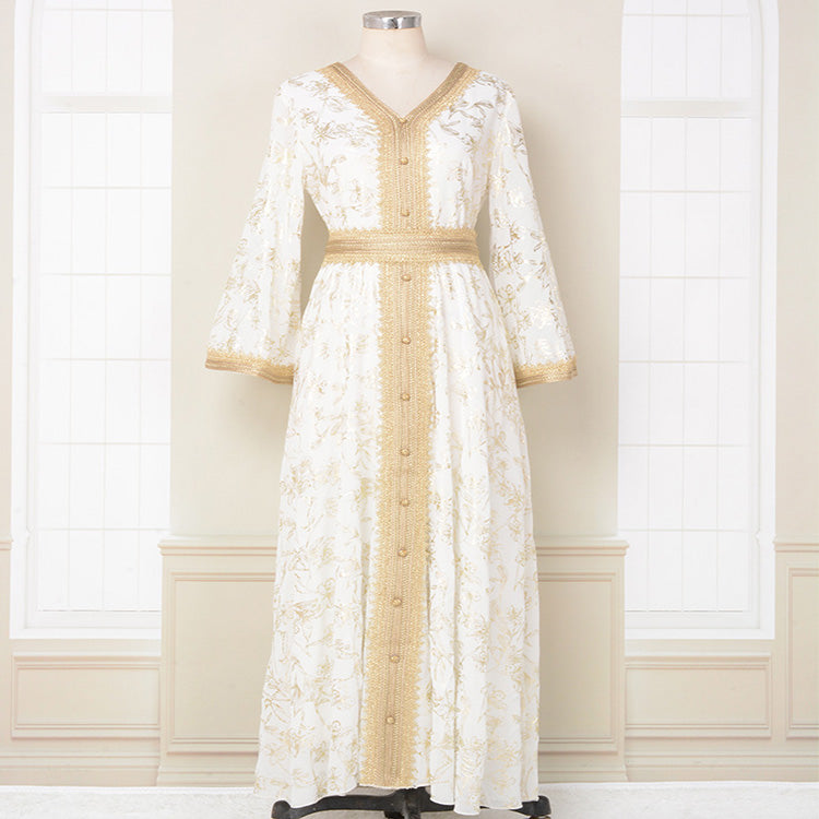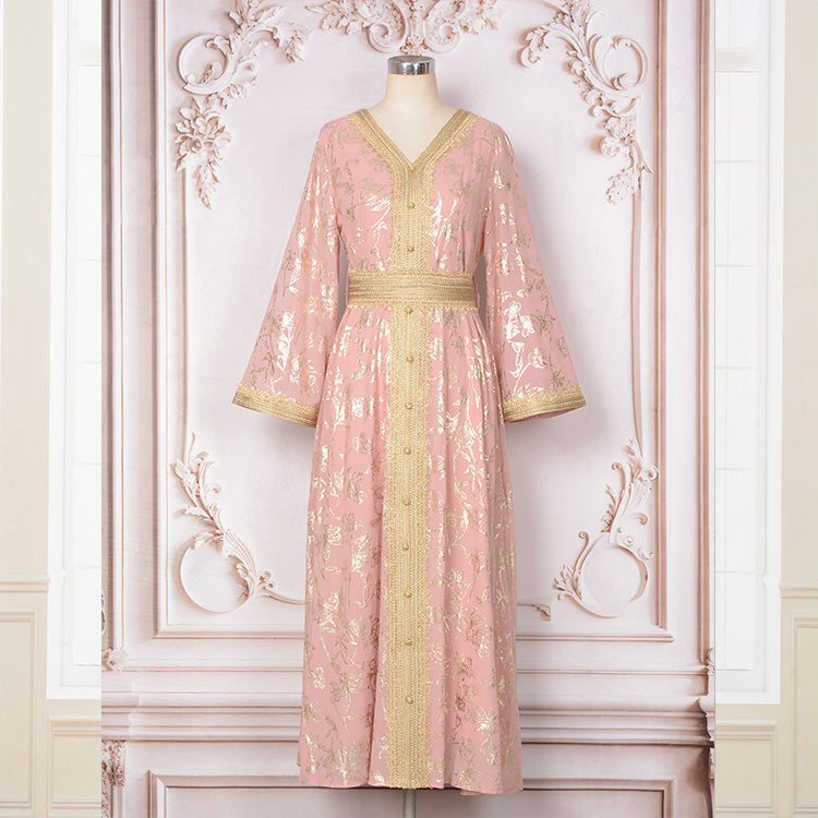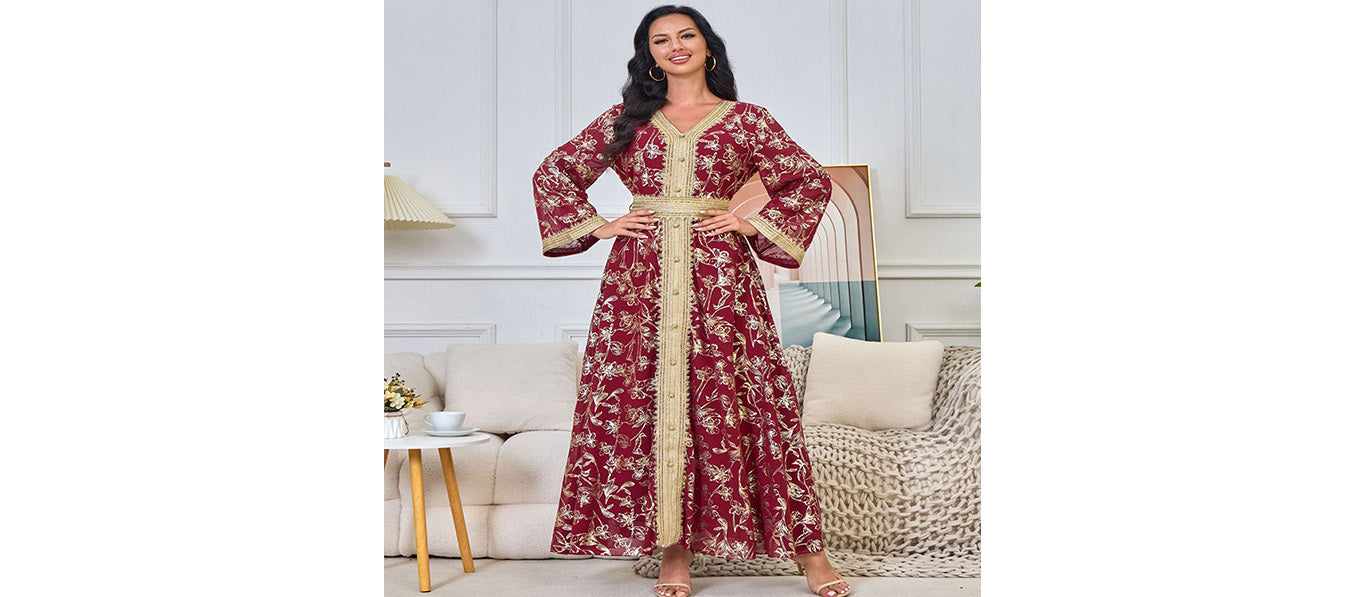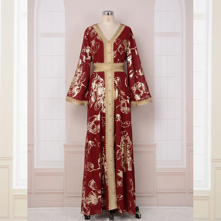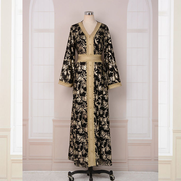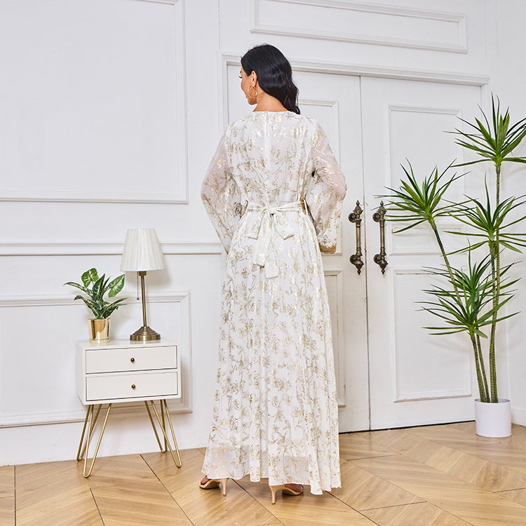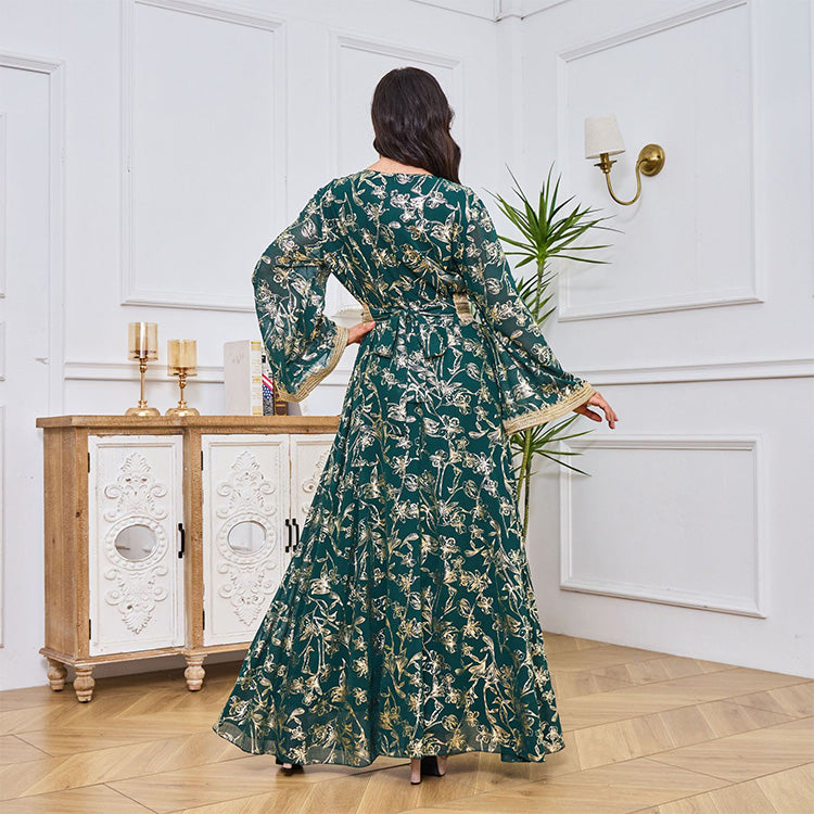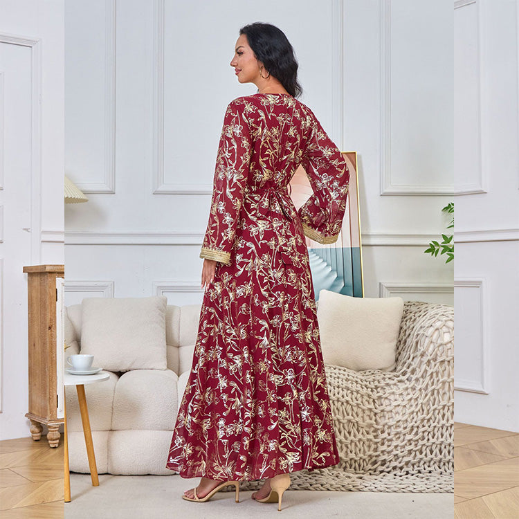 فستان نسائي عصري برقبة على شكل V، مزين بنقشة زهور، يتميز بتصميم طويل ولامع.