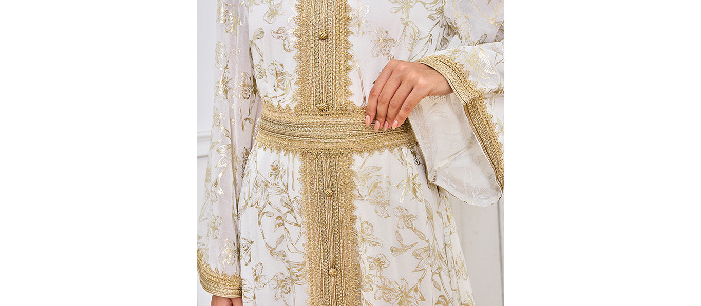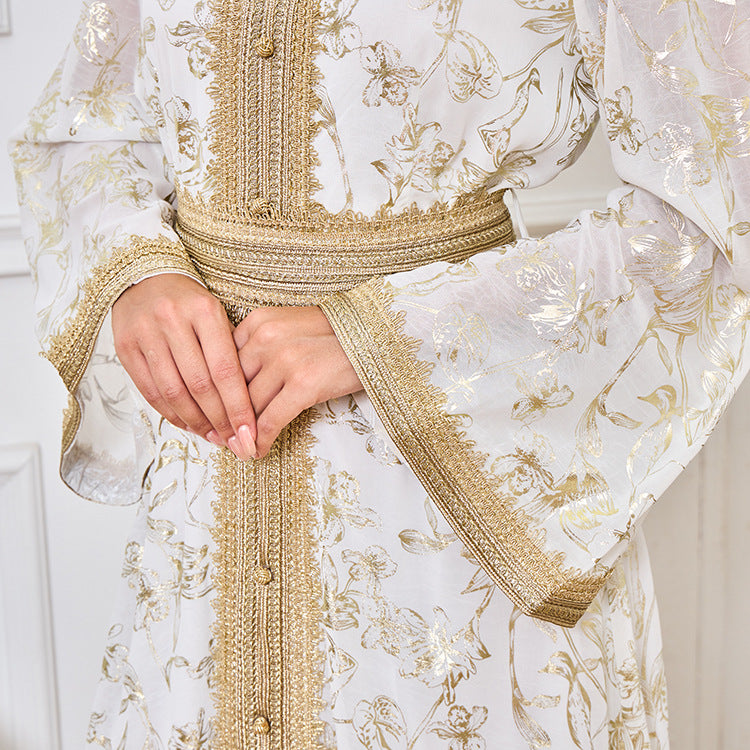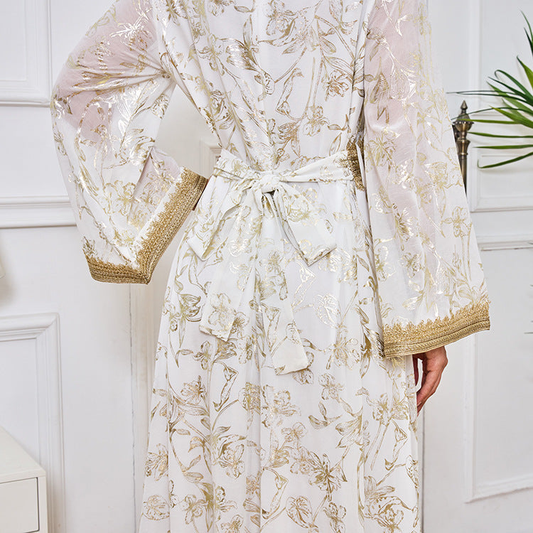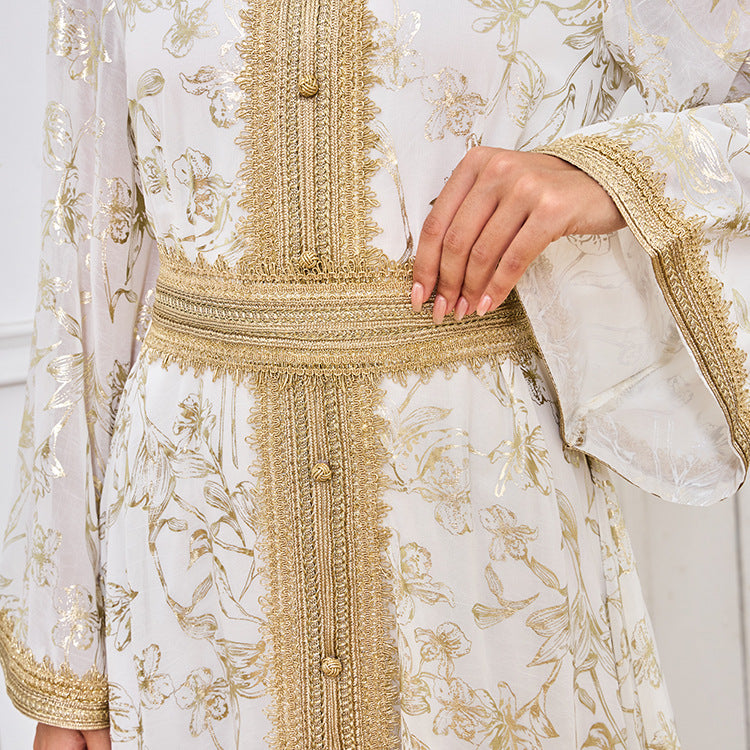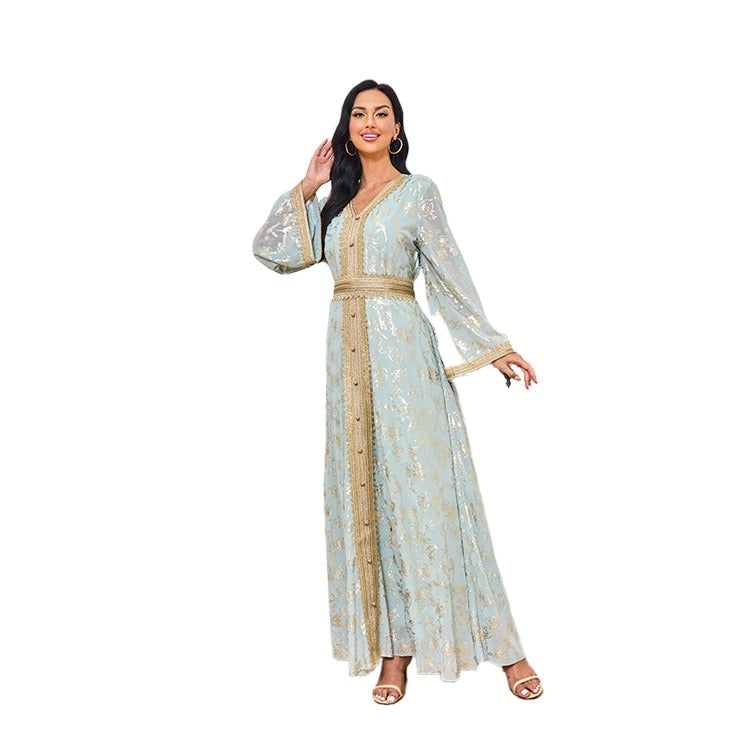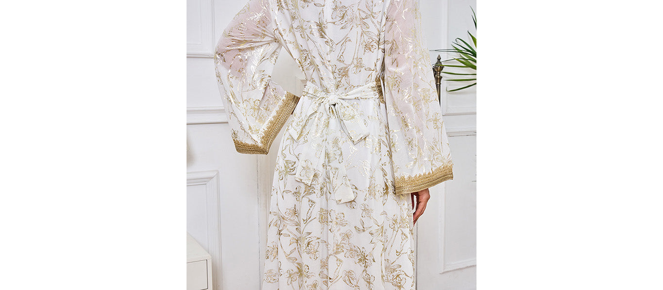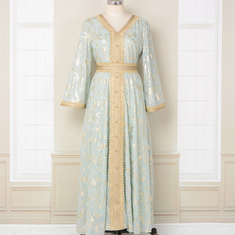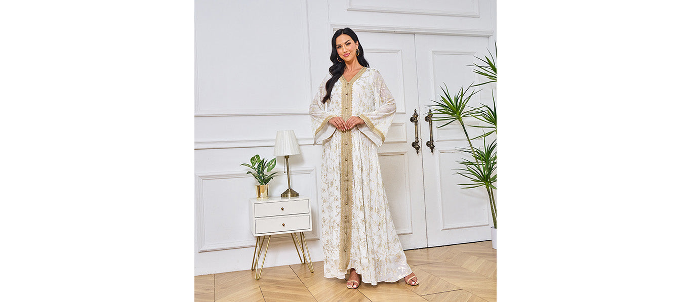 فستان نسائي عصري برقبة على شكل V، مزين بنقشة زهور، يتميز بتصميم طويل ولامع.