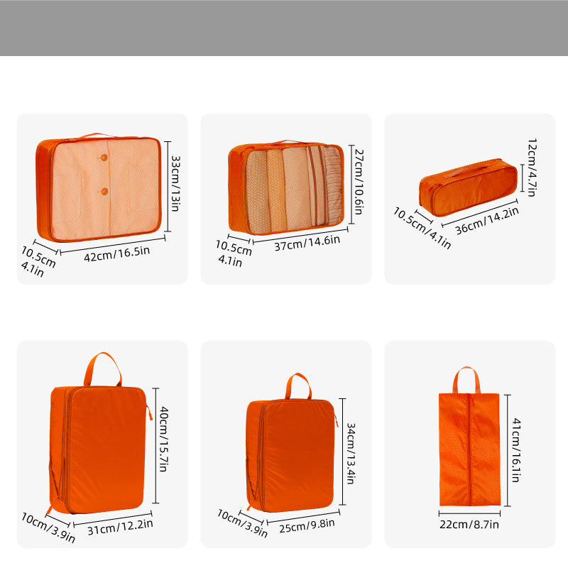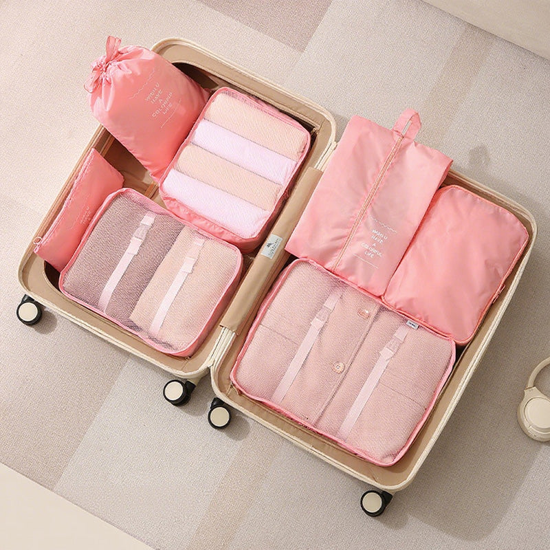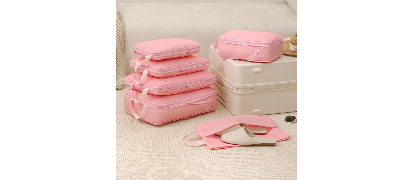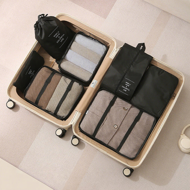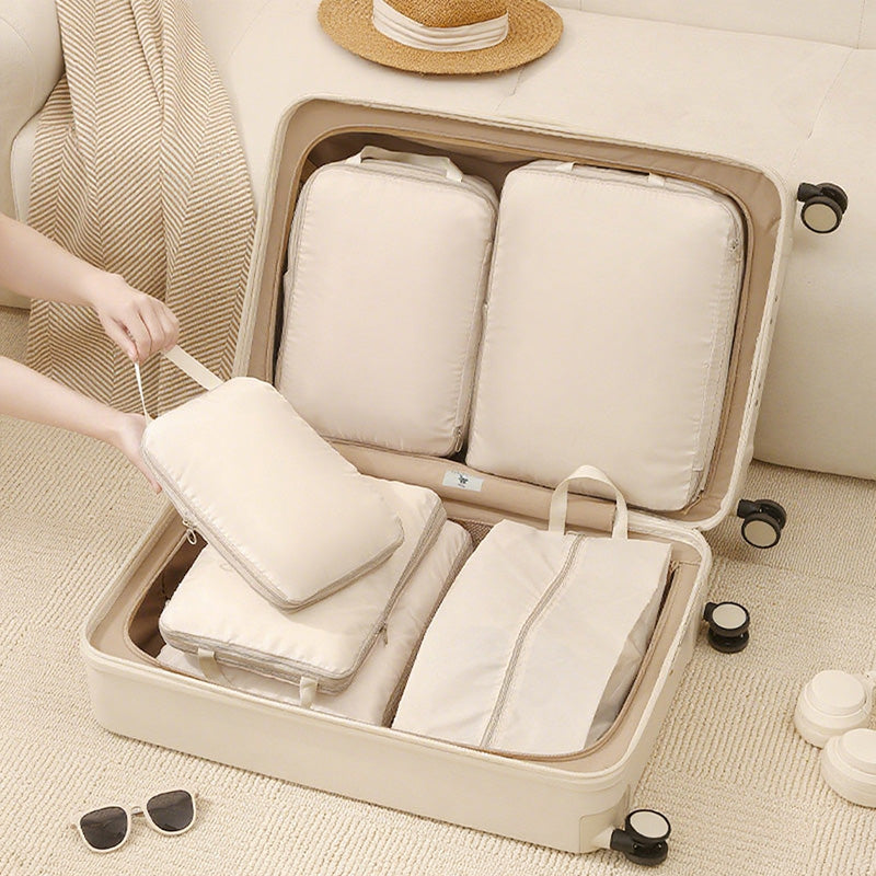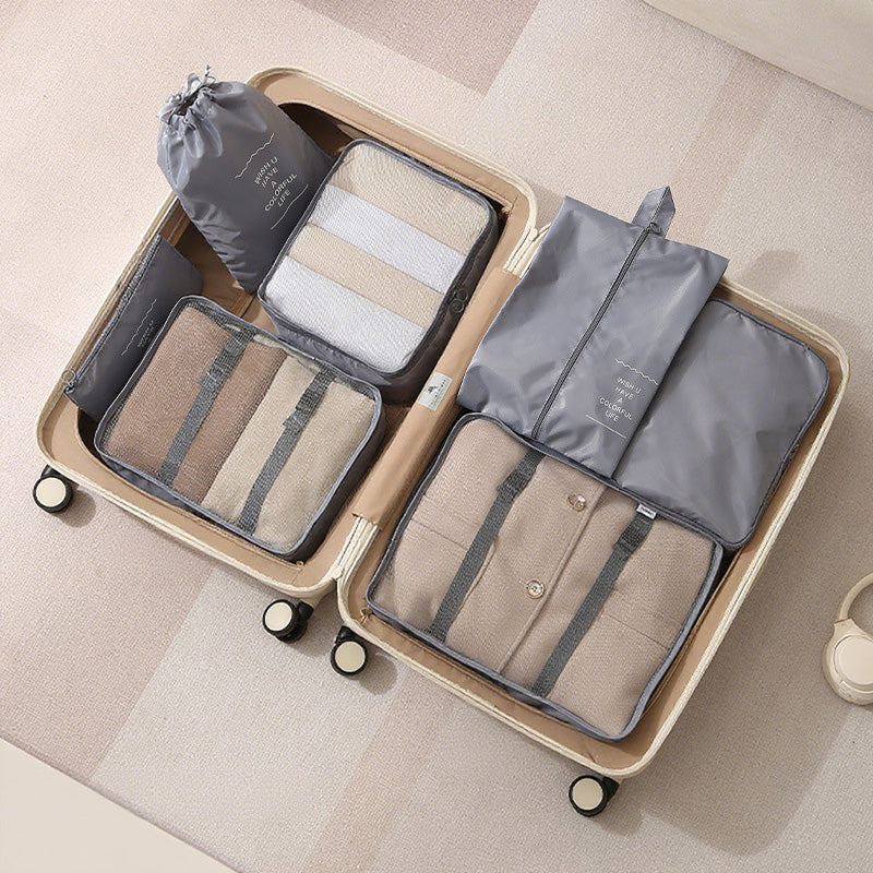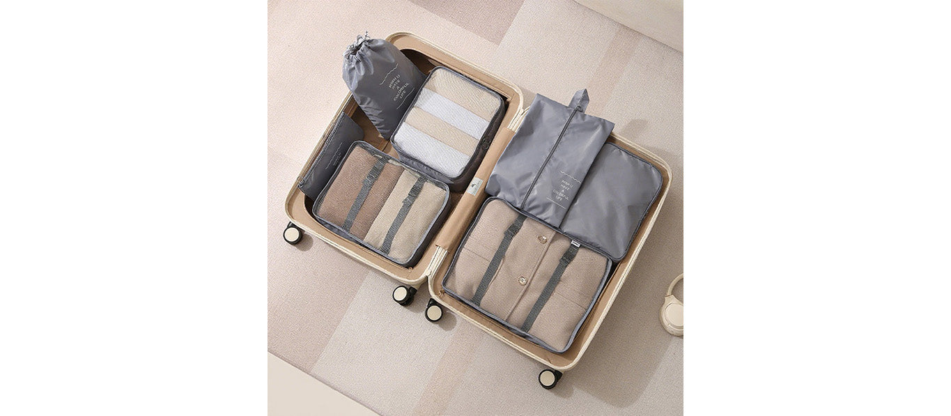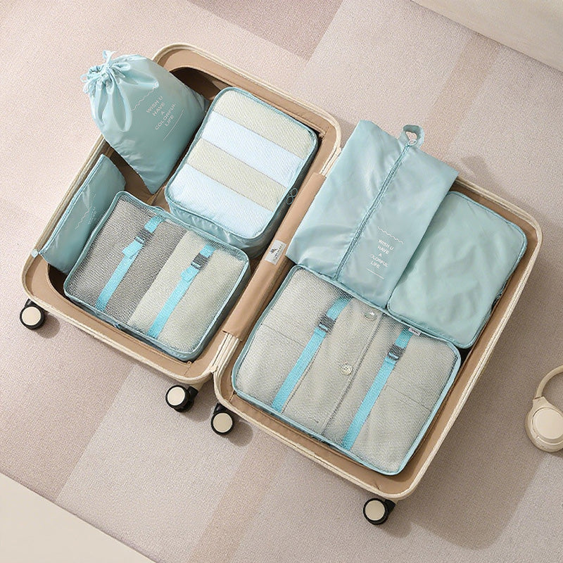 توفر مجموعة أدوات تنظيم السفر المكونة من سبع قطع حلاً عمليًا وفعالًا لتعبئة الأمتعة. تتميز أداة التنظيم الشبكية بمقبض مريح لسهولة الحمل ويمكن تثبيتها بإحكام على حقيبة السفر.