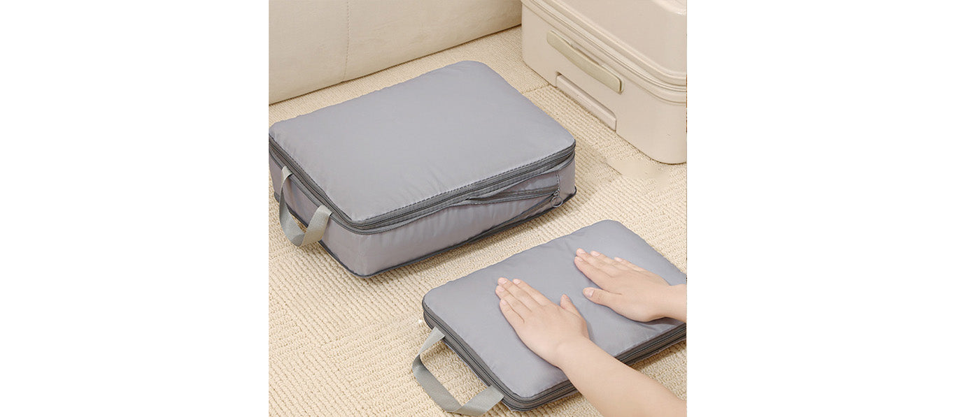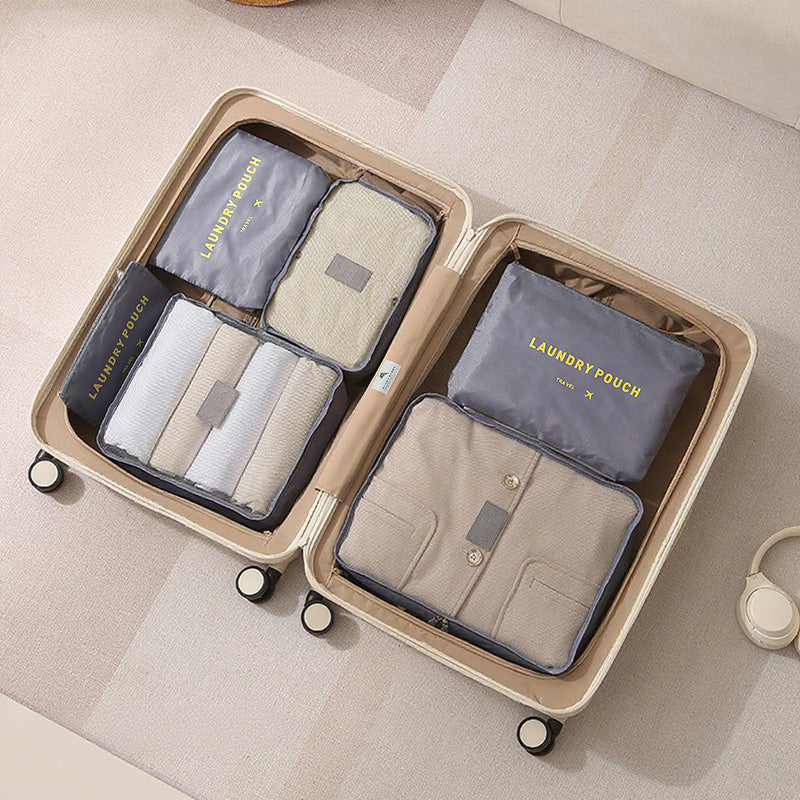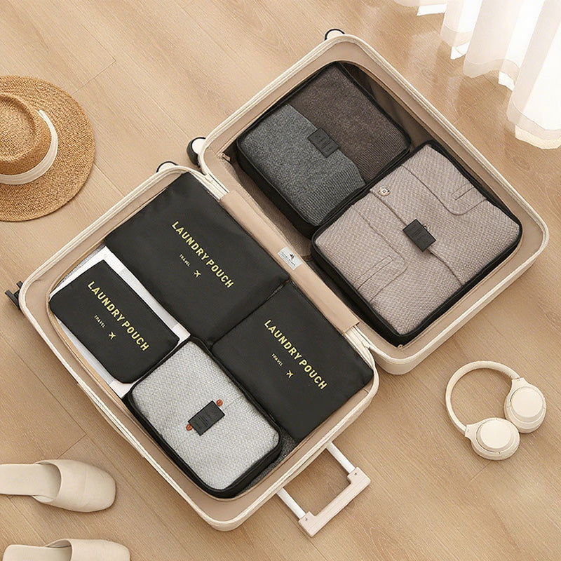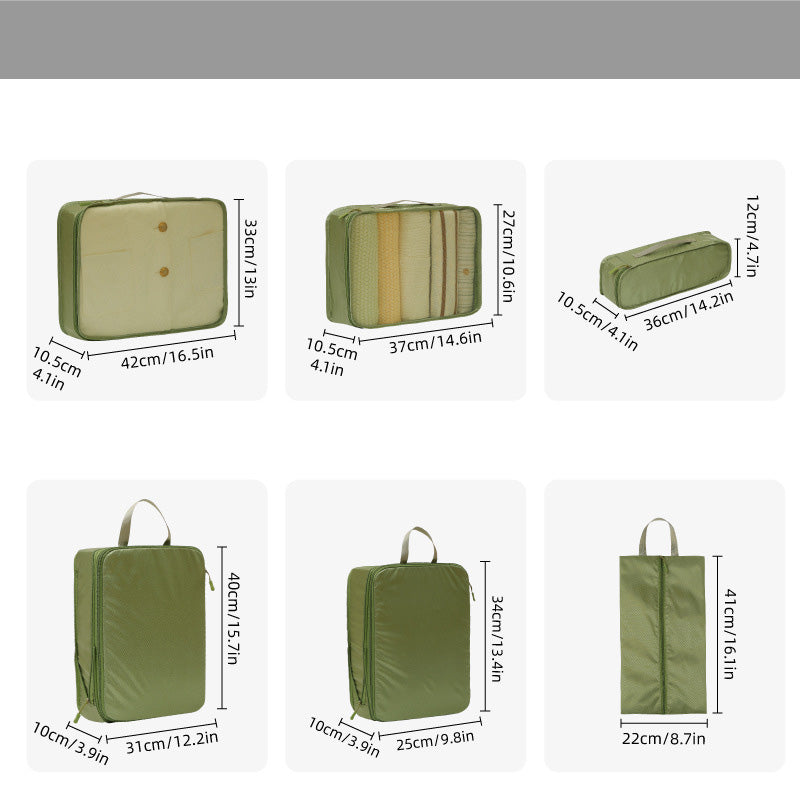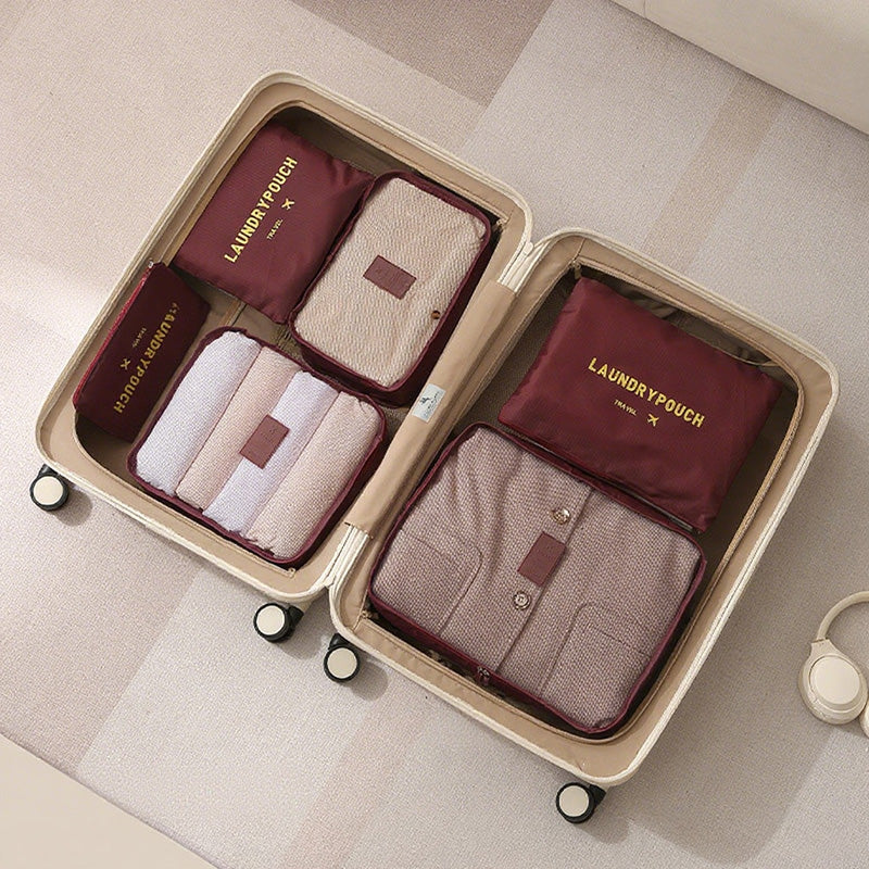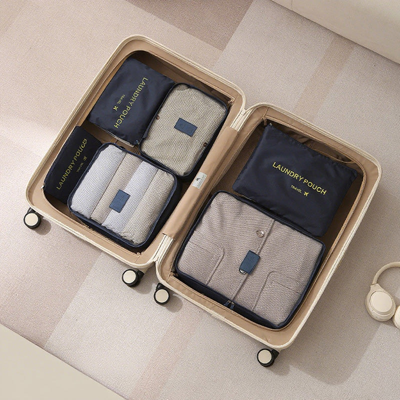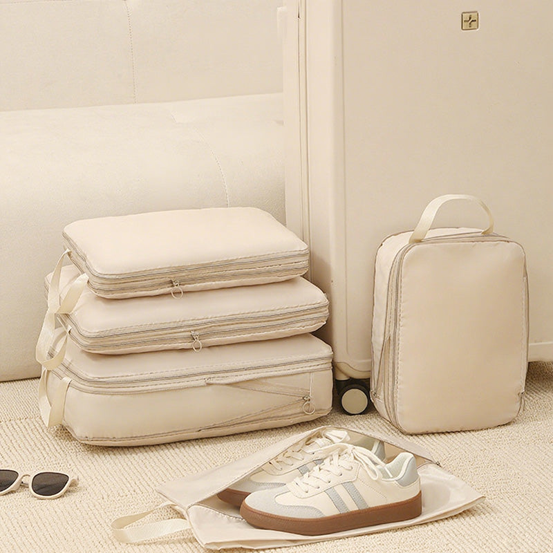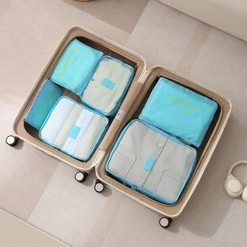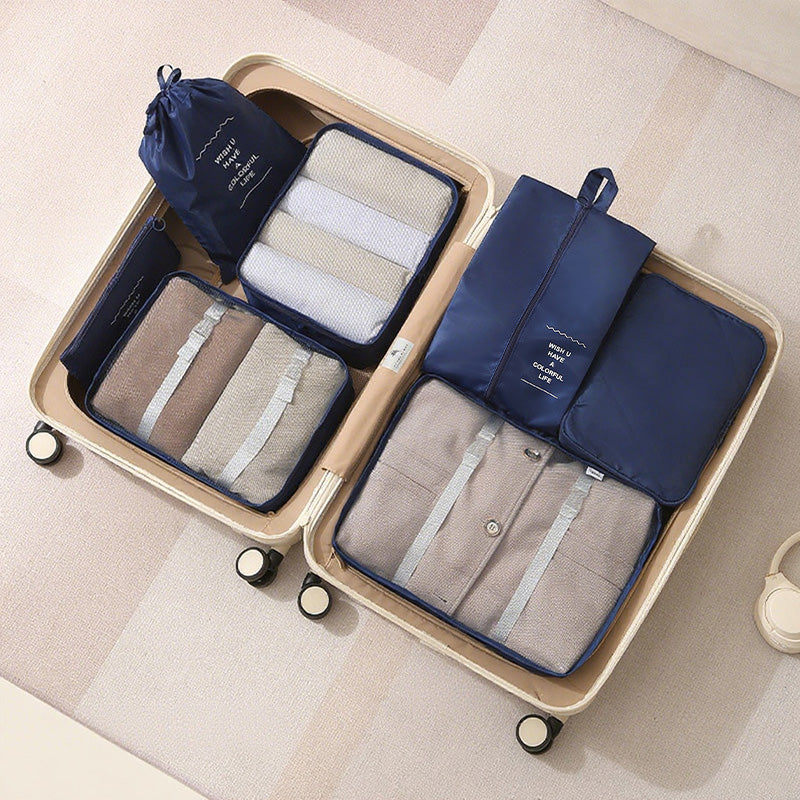 توفر مجموعة أدوات تنظيم السفر المكونة من سبع قطع حلاً عمليًا وفعالًا لتعبئة الأمتعة. تتميز أداة التنظيم الشبكية بمقبض مريح لسهولة الحمل ويمكن تثبيتها بإحكام على حقيبة السفر.