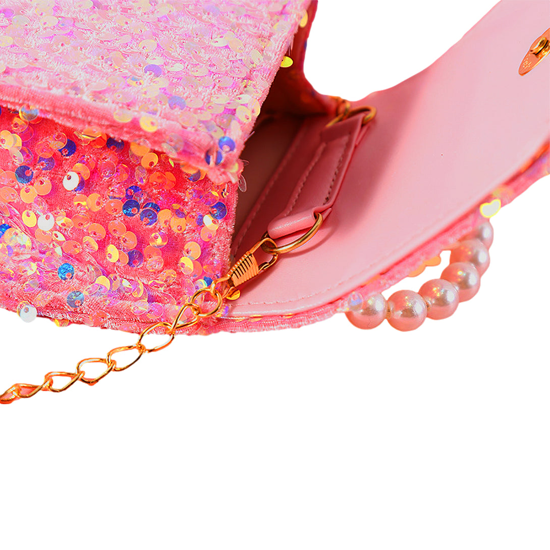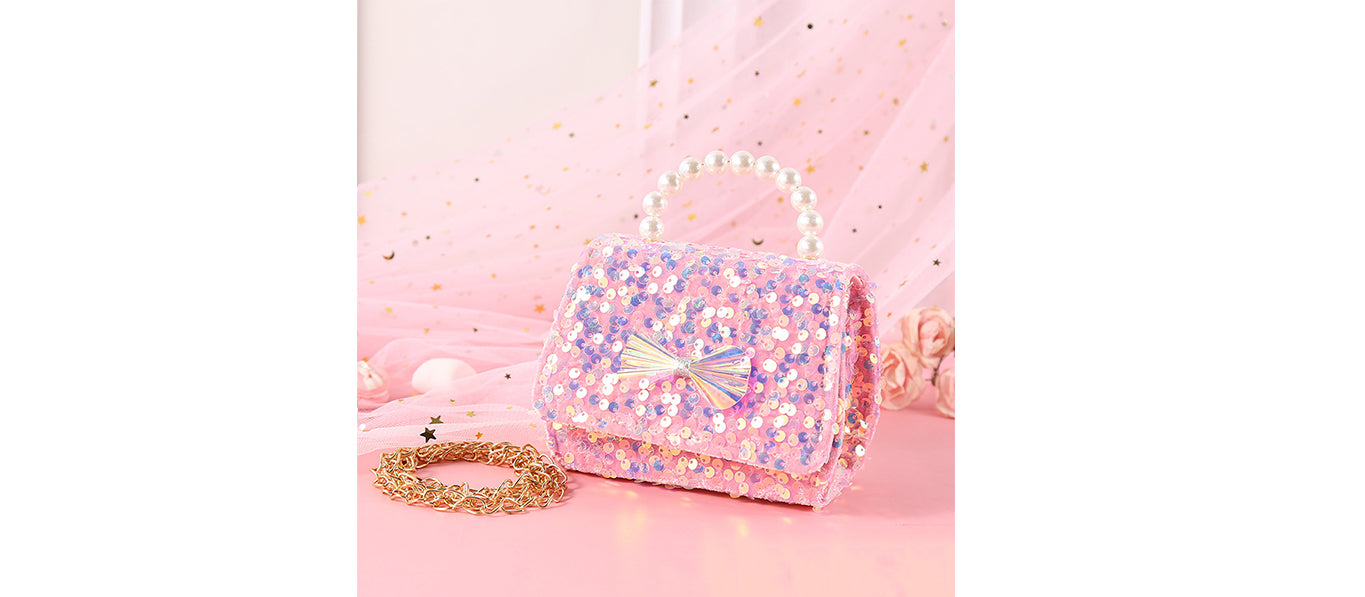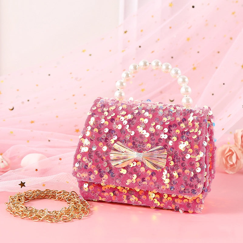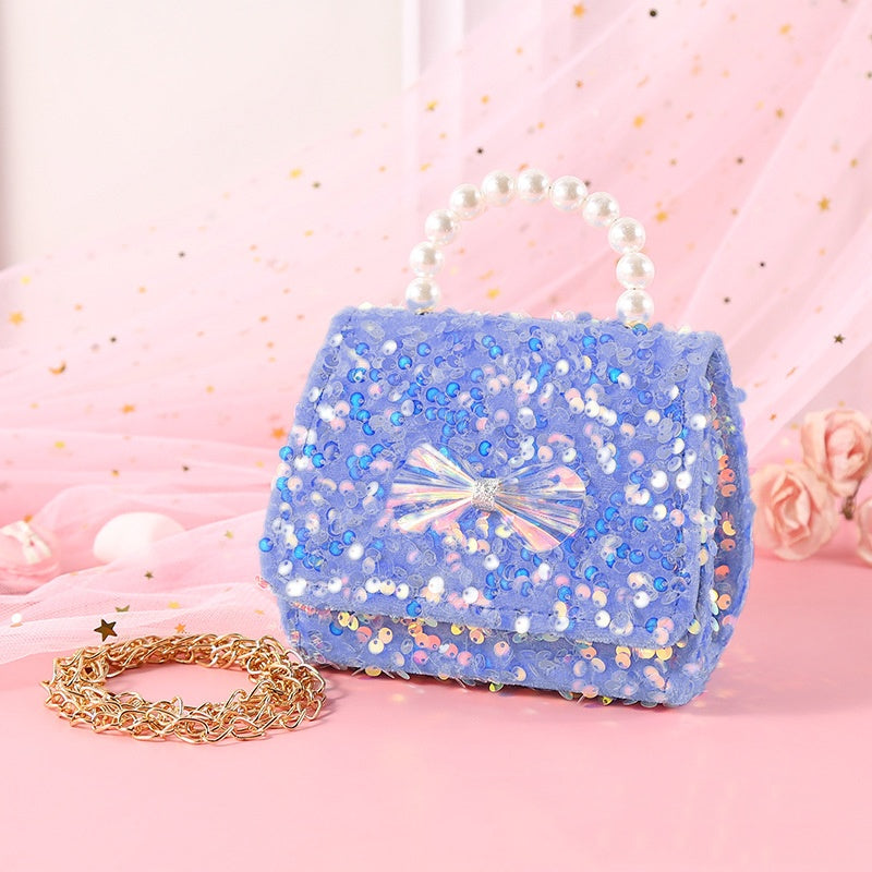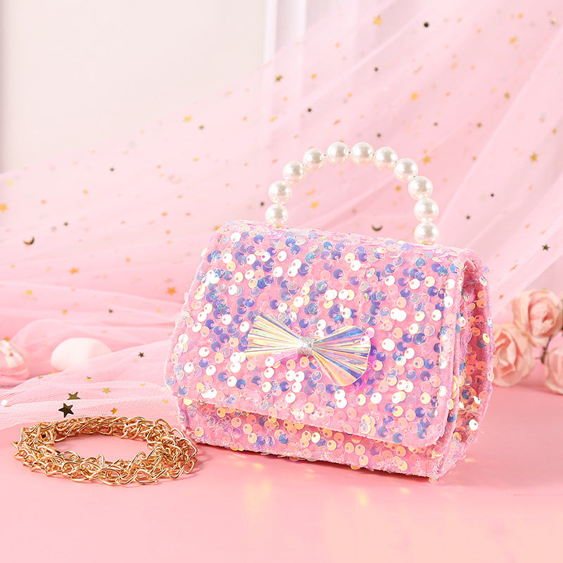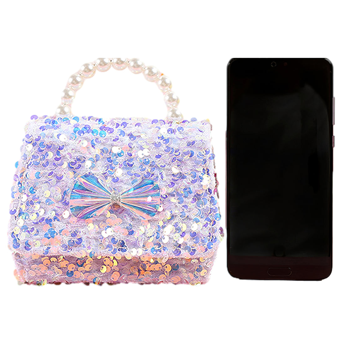 حقيبة يد صغيرة لامعة مصممة خصيصًا للفتيات الصغيرات، مزينة بزخارف من الترتر.