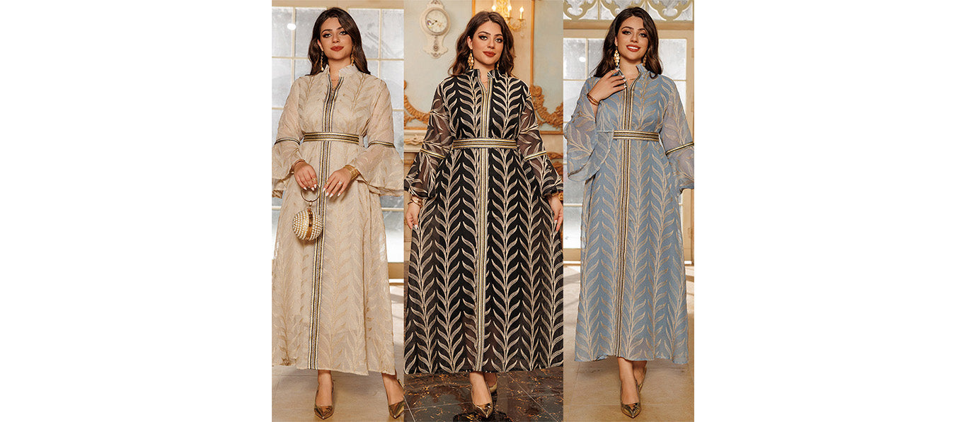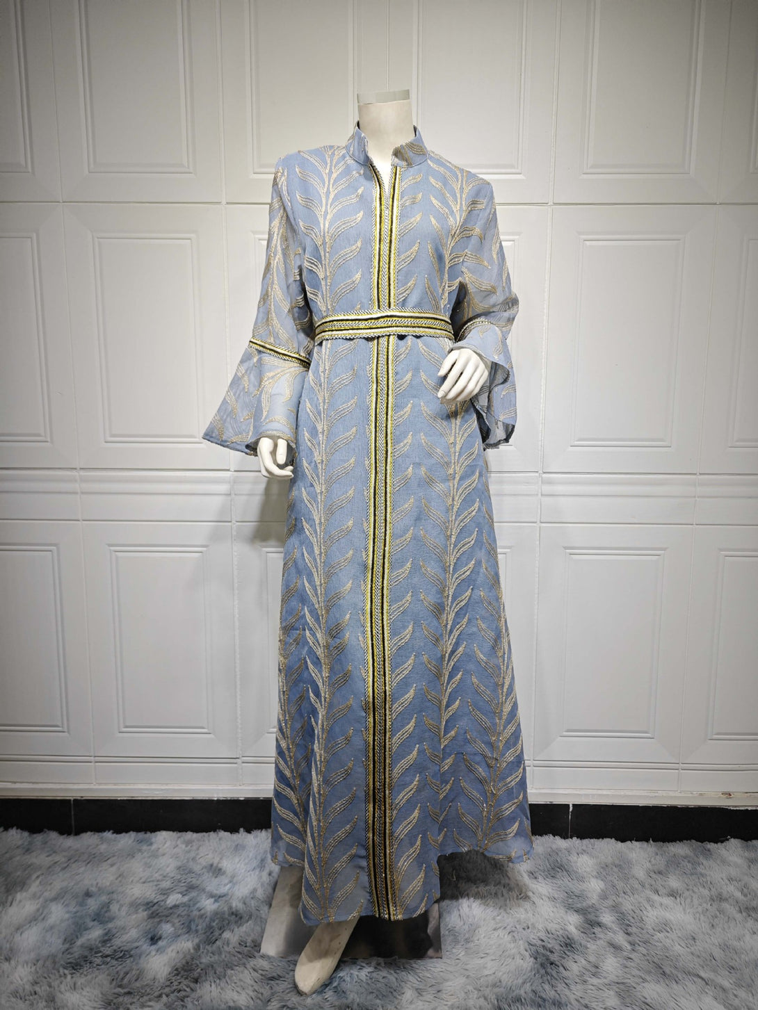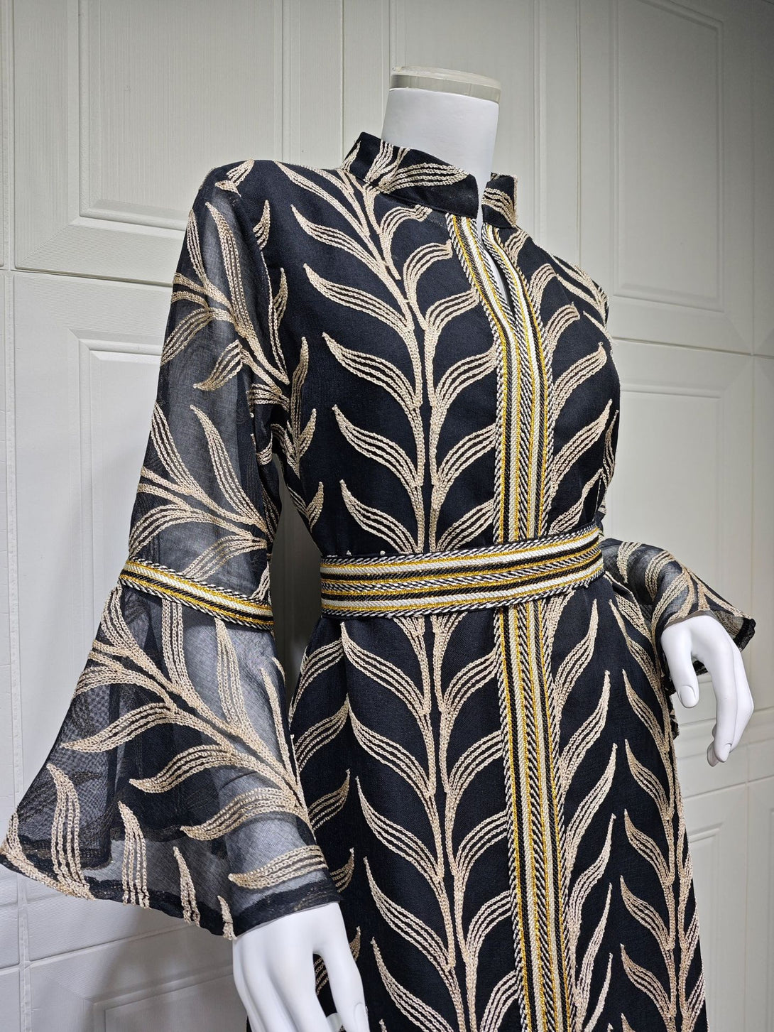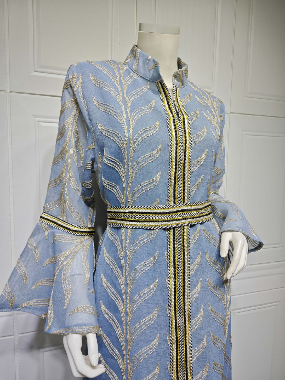 رداء قفطان نسائي أنيق بأكمام واسعة مطرزة مع حزام