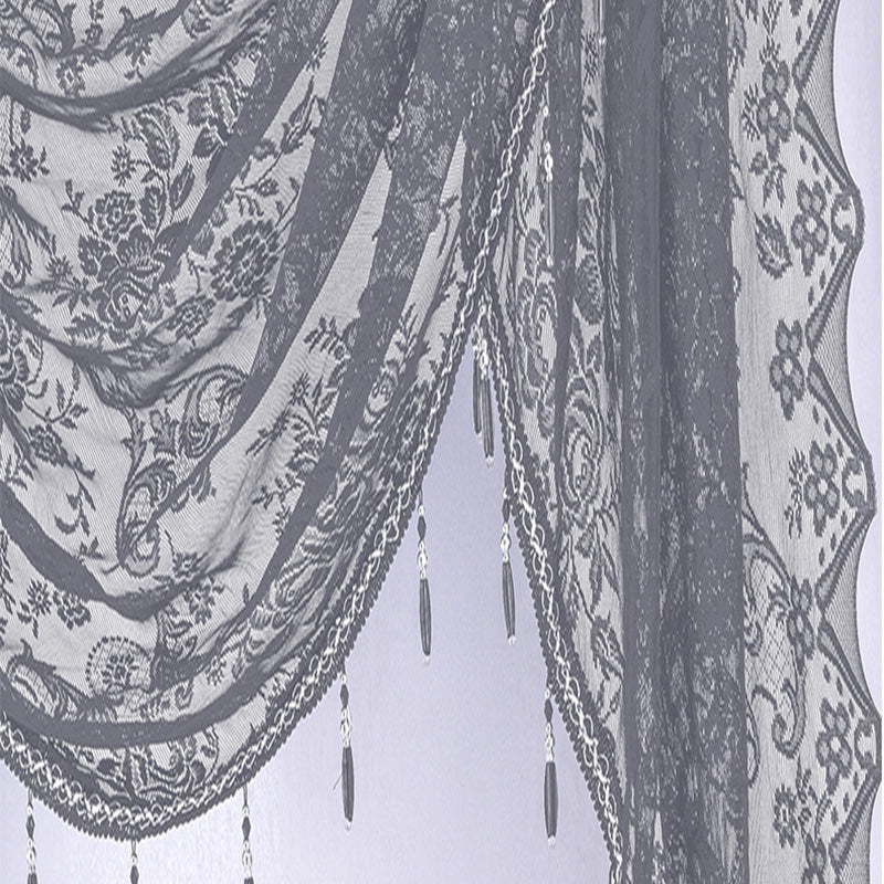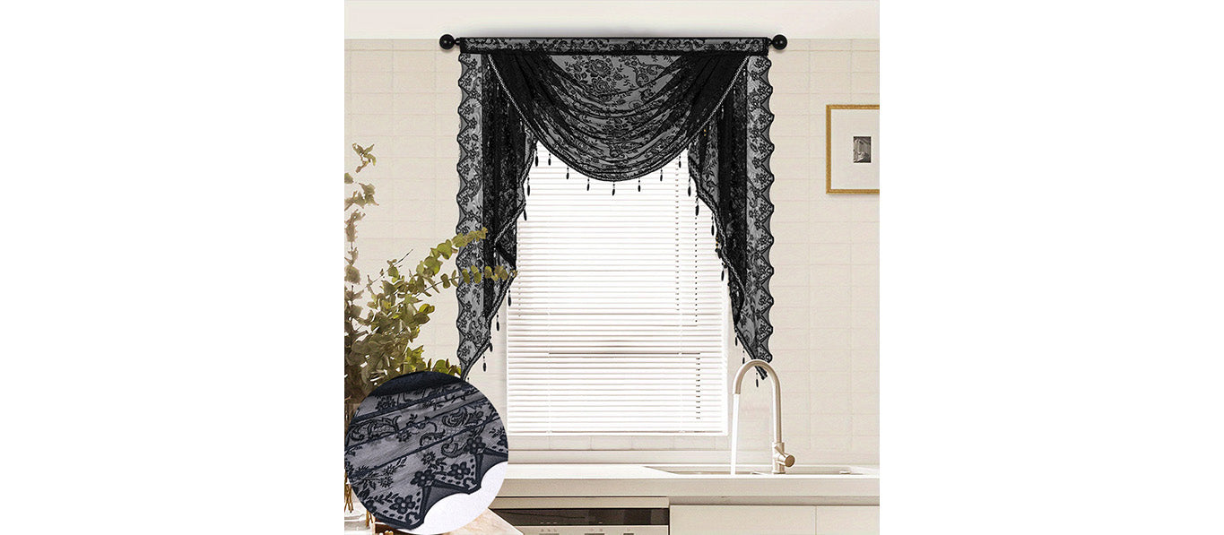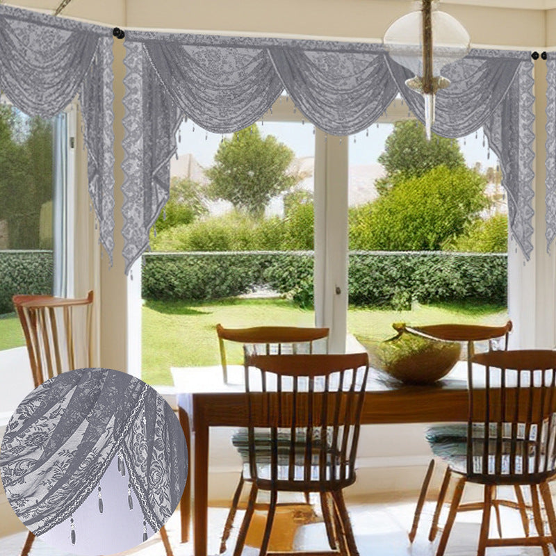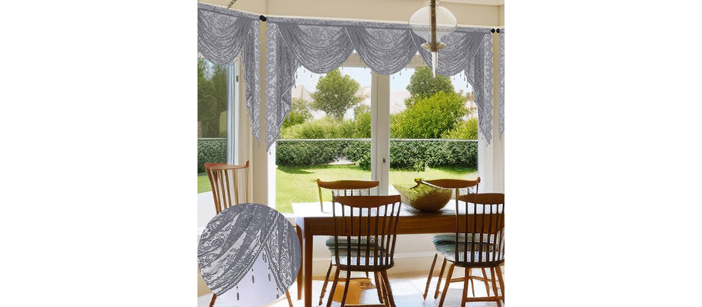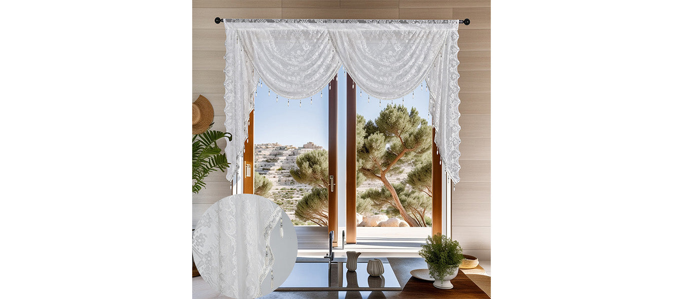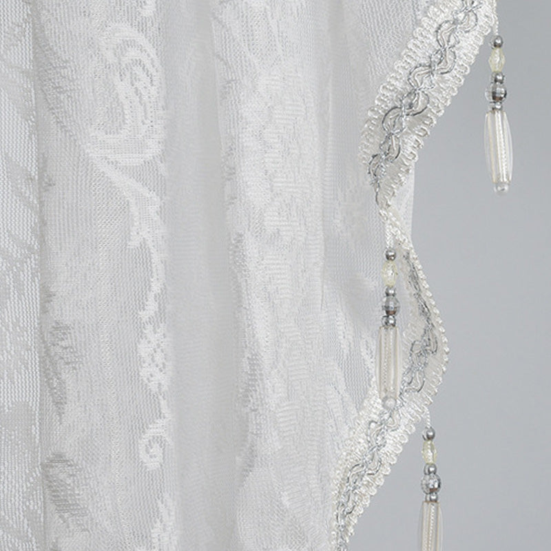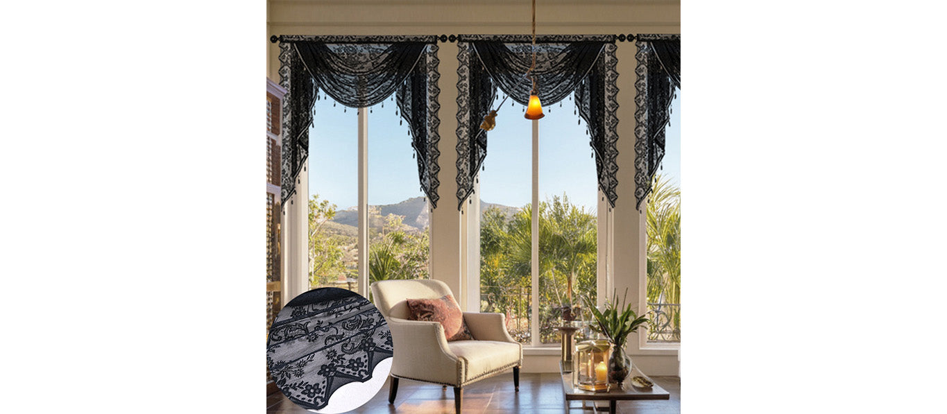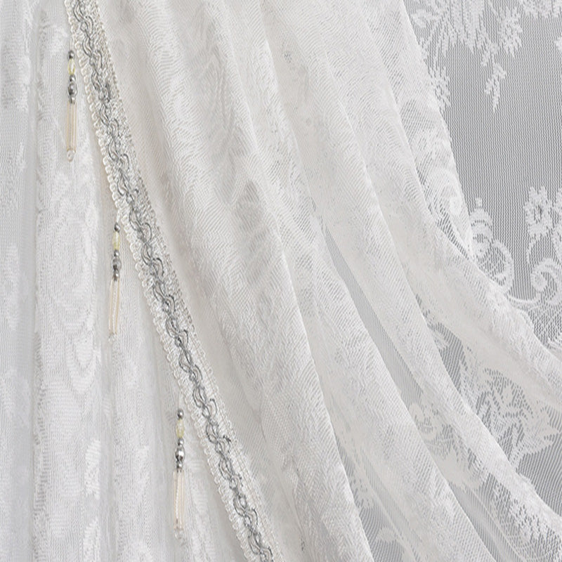 ستائر من الدانتيل المطرز بالخرز للنوافذ في غرفة المعيشة