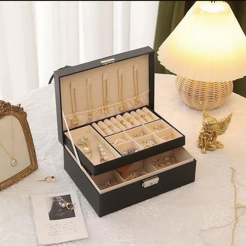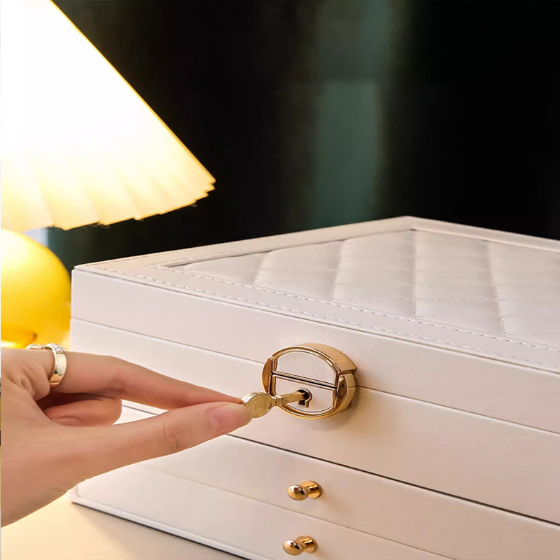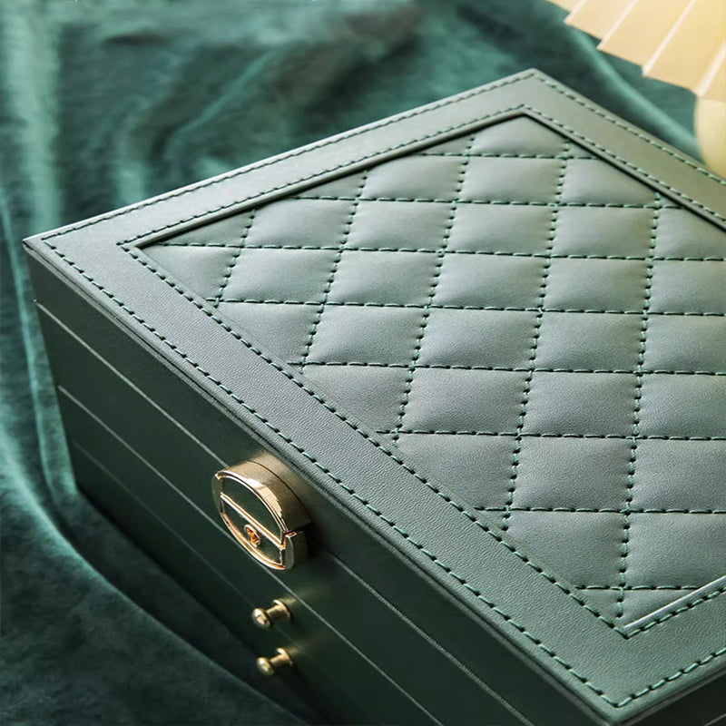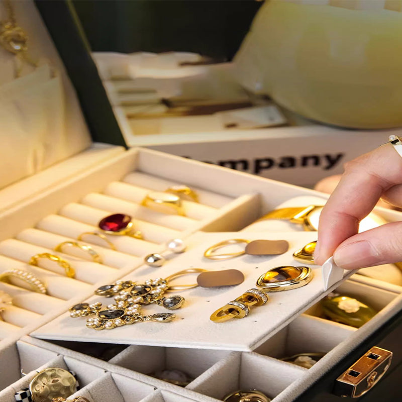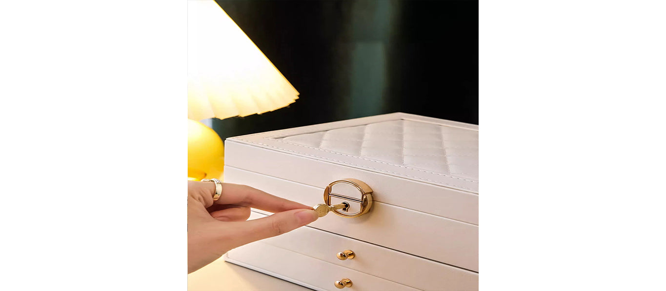 صندوق مجوهرات بثلاثة طوابق مصمم بعناية لتنظيم مجوهراتك بشكل فعال وآمن. أدراج قابلة للقفل ومبطنة بالقطيفة تحمي القلائد والأقراط والخواتم من الخدوش والتشابك.