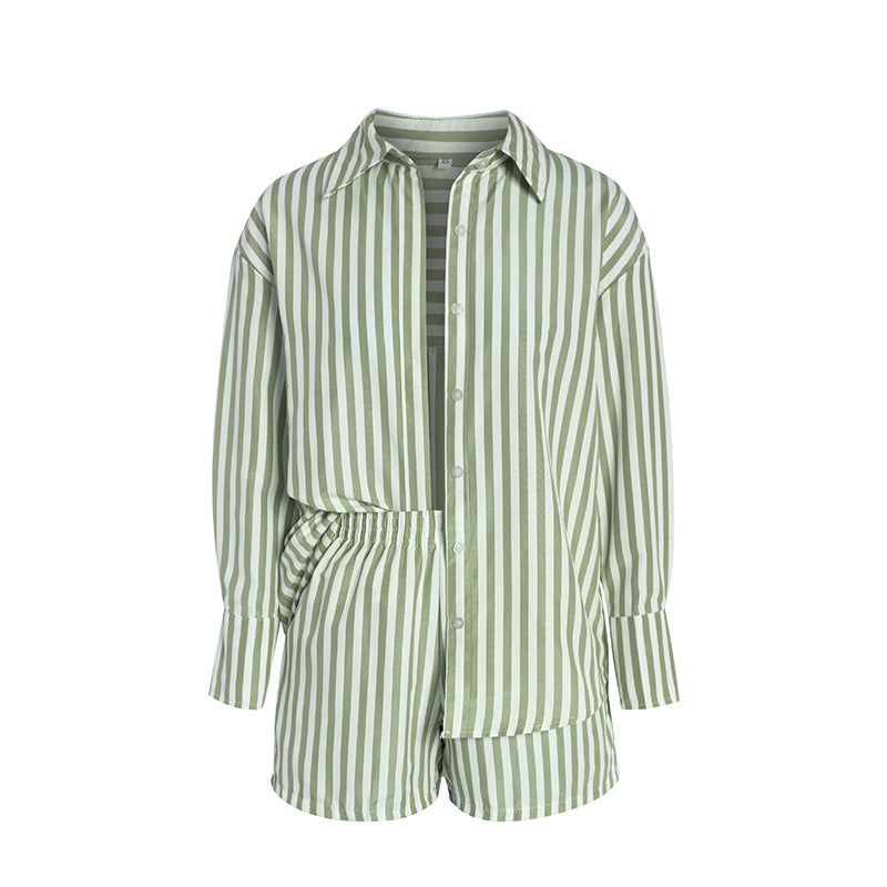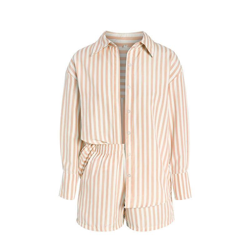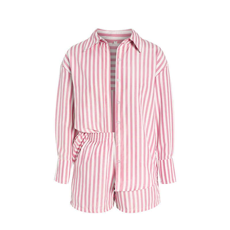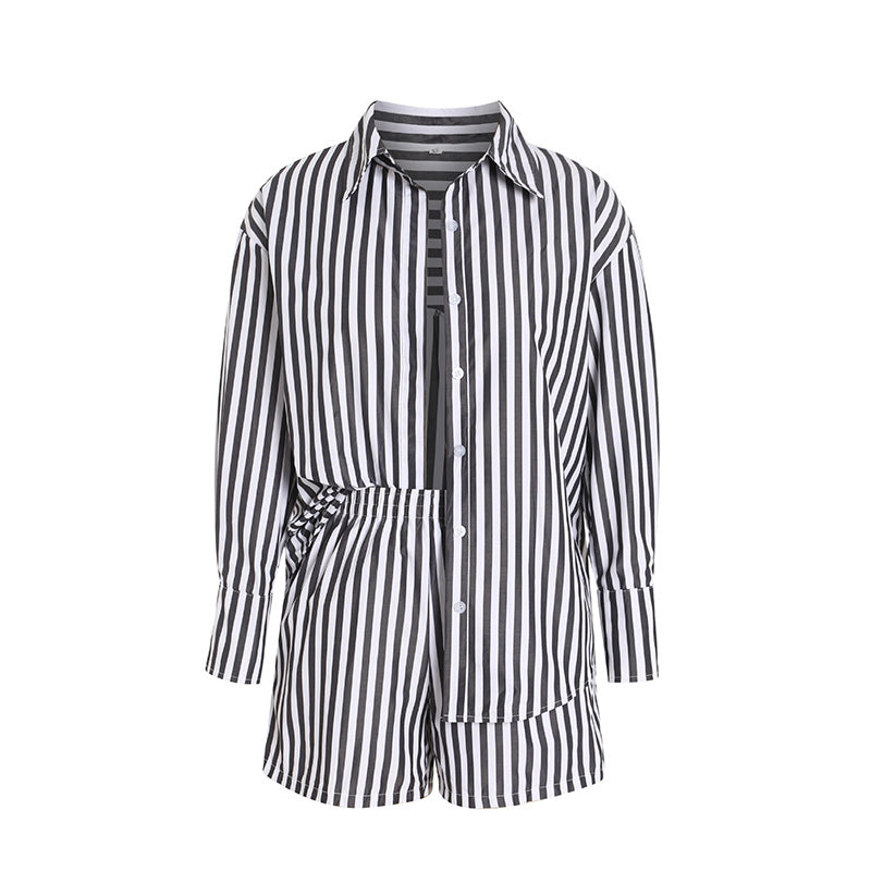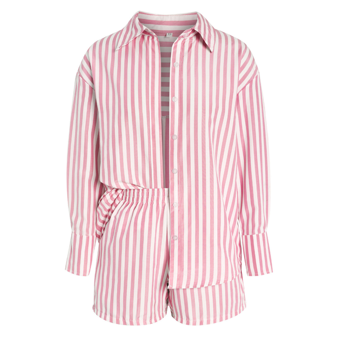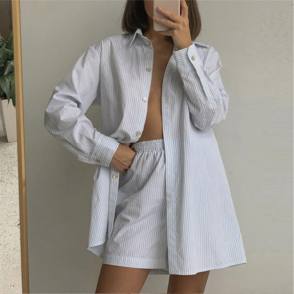 طقم قميص طويل الأكمام وشورت مخطط صيفي للنساء