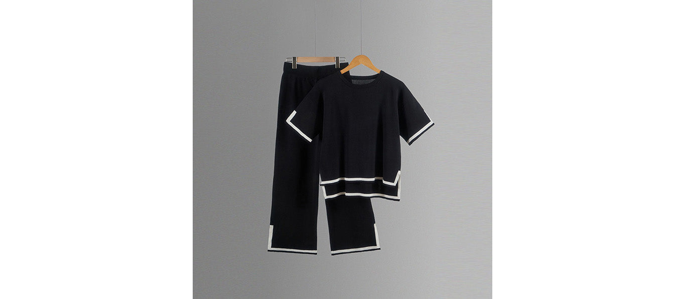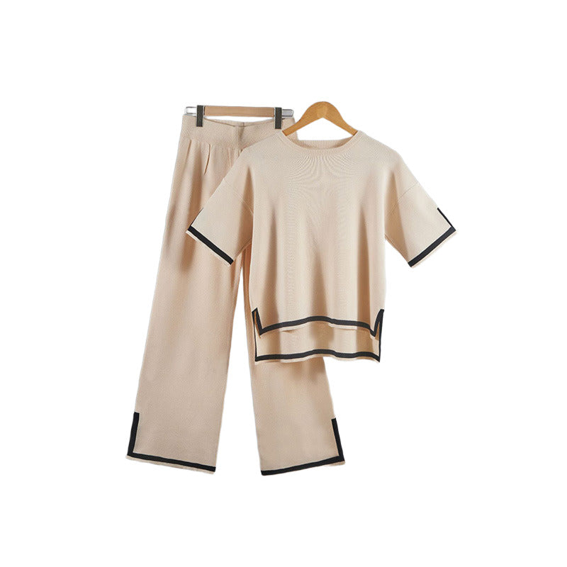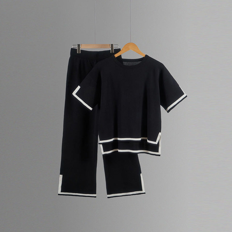 طقم محبوك مع بلوزة قصيرة الأكمام وسروال واسع