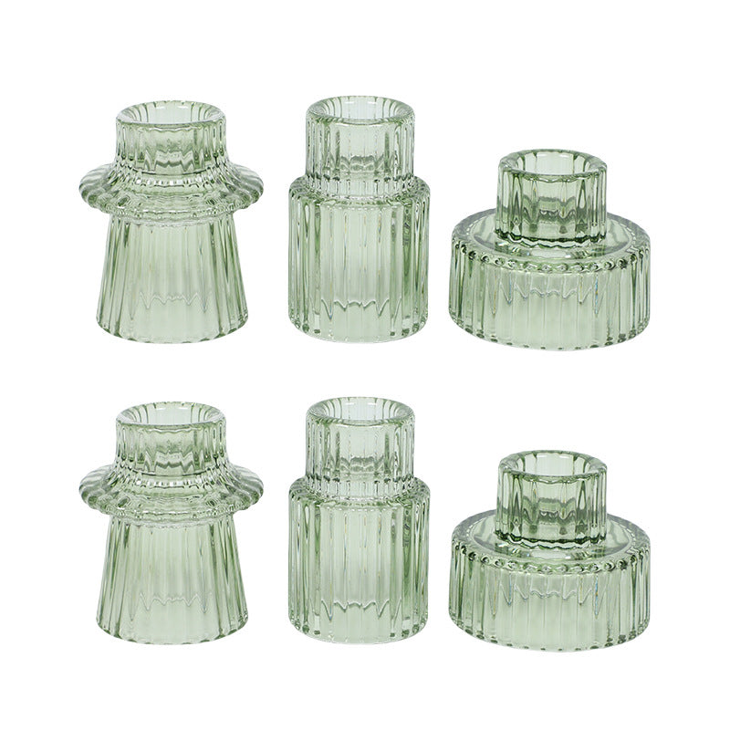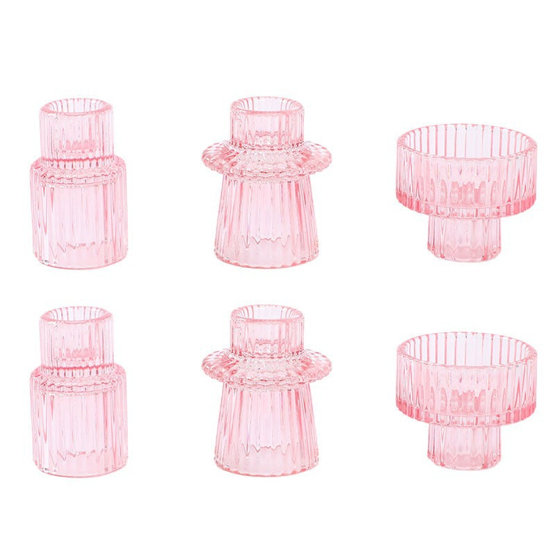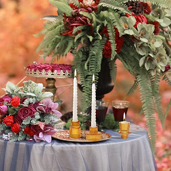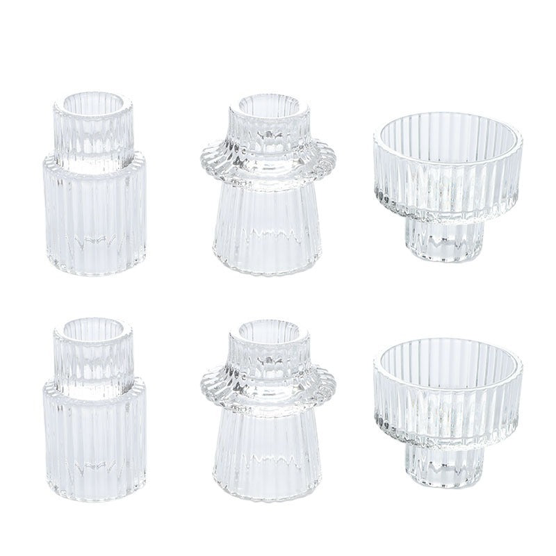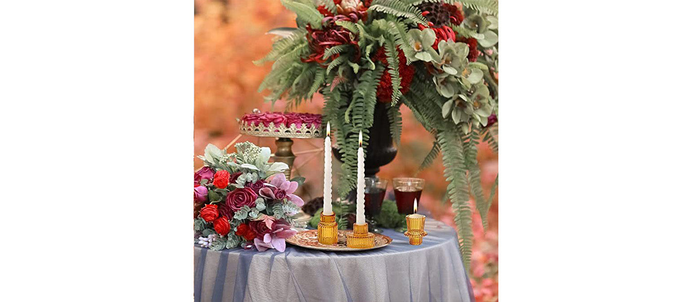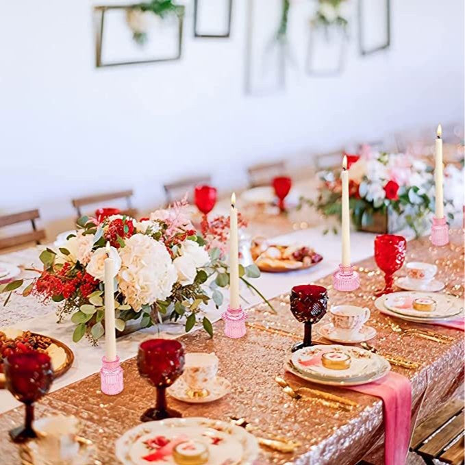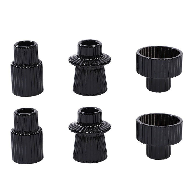 مجموعة من الشمعدانات المصغرة تتألف من ستة حاملات شموع زخرفية مدببة، تضفي لمسة أنيقة ورومانسية على احتفالات الزفاف.
