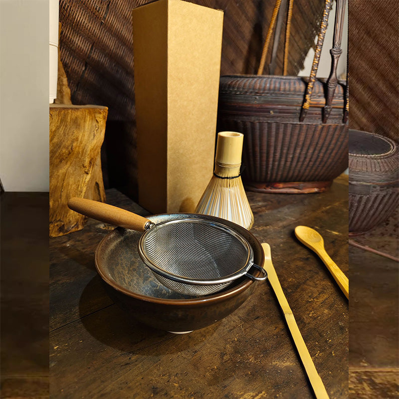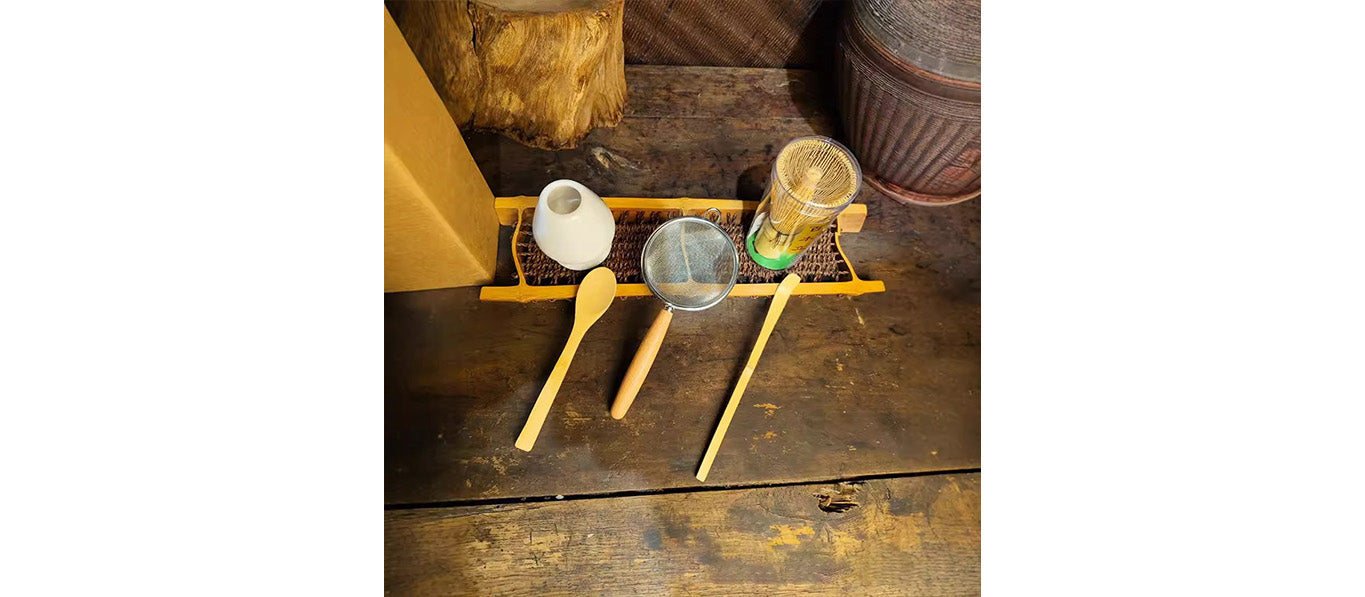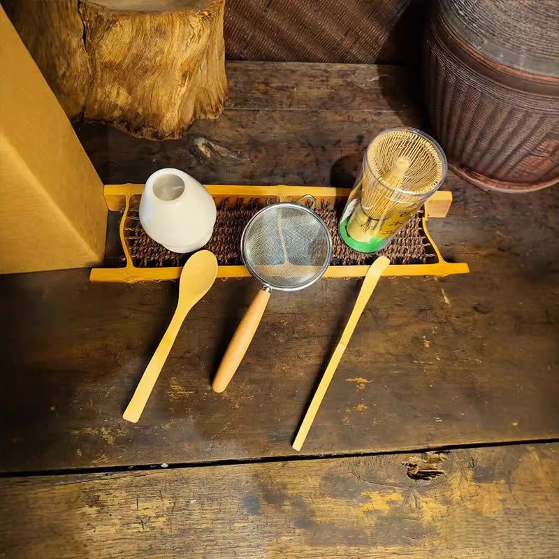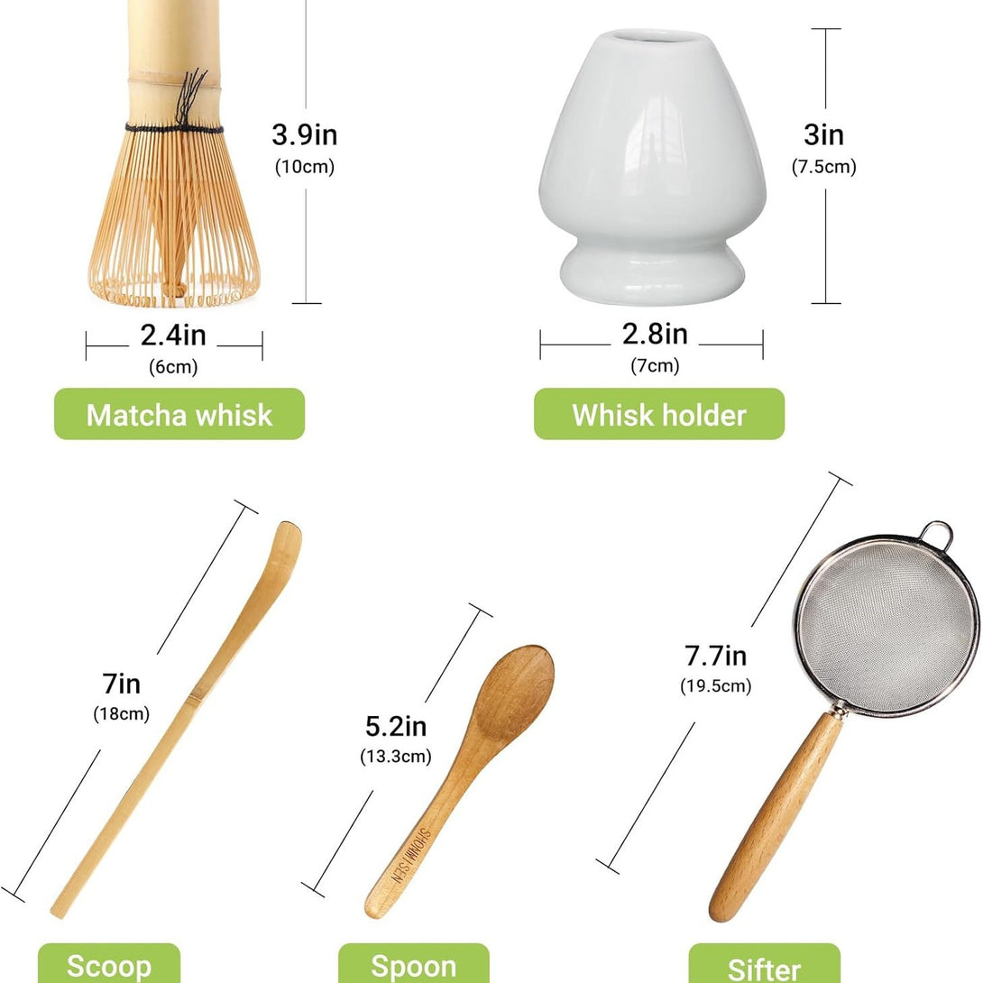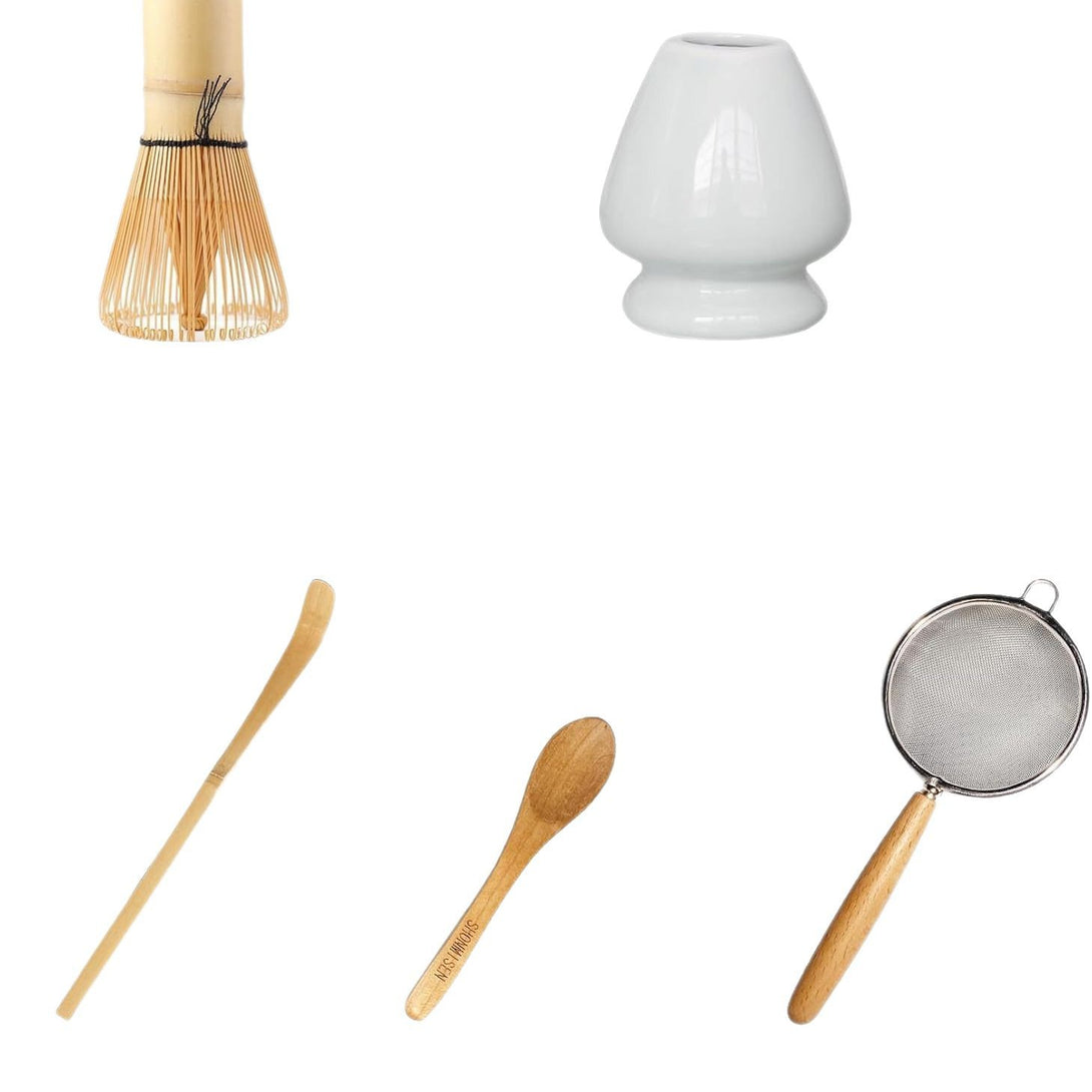 تتكون مجموعة أدوات حفل شاي الماتشا الياباني الكاملة من خمسة أدوات أساسية لتحضير شاي الماتشا الفاخر. وهي تشمل خفاقة مصنوعة يدويًا من الخيزران، وحامل خفاقة أنيق من السيراميك للحفاظ على شكلها، ومغرفة شاي لقياس المسحوق بدقة، ومصفاة مسحوق الشاي لضمان نقع سلس، وملعقة ماتشا للمساعدة في التحضير.