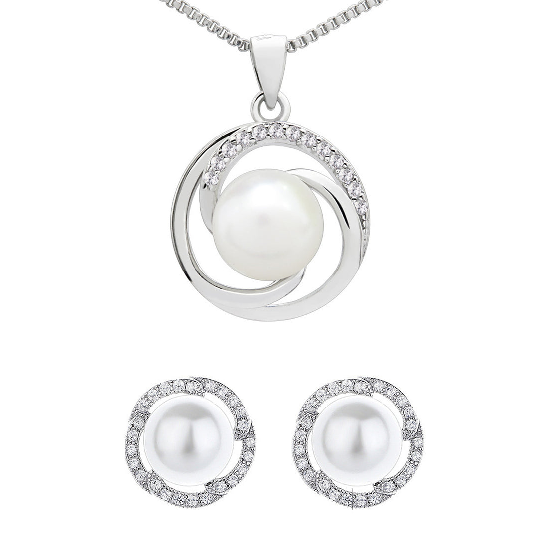 طقم قلادة قلادة زركون نسائية قلادة وأقراط 925 فضة إسترليني من حجر الراين لؤلؤة المياه العذبة