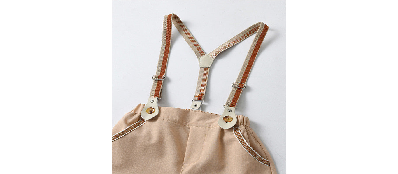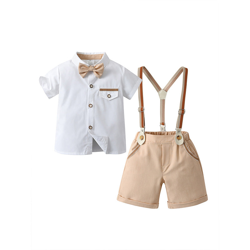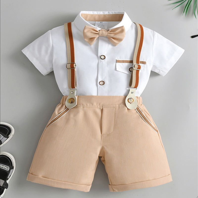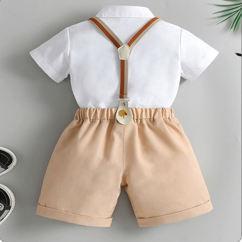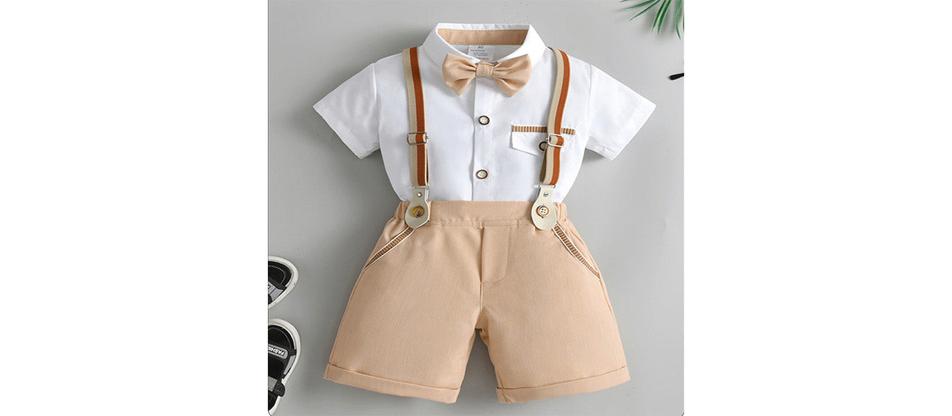 طقم رسمي صيفي مصمم خصيصًا للشباب، يتألف من قميص قصير الأكمام وربطة عنق وحمالات، مصنوع ليمنح مظهرًا أنيقًا ومريحًا في آن واحد.