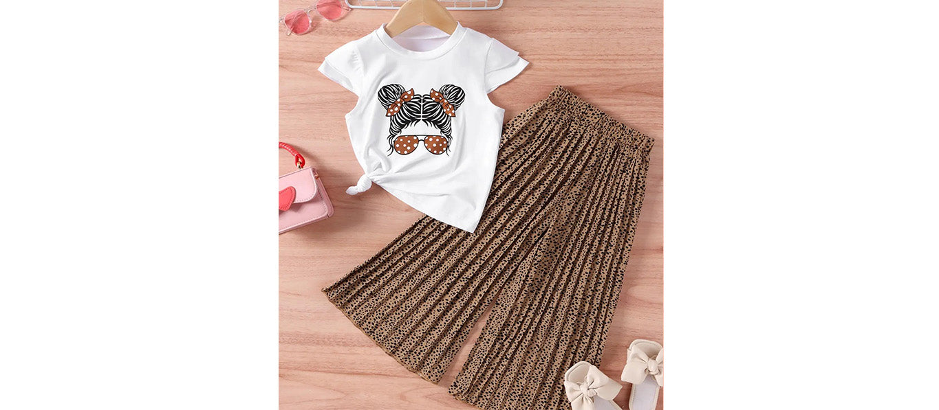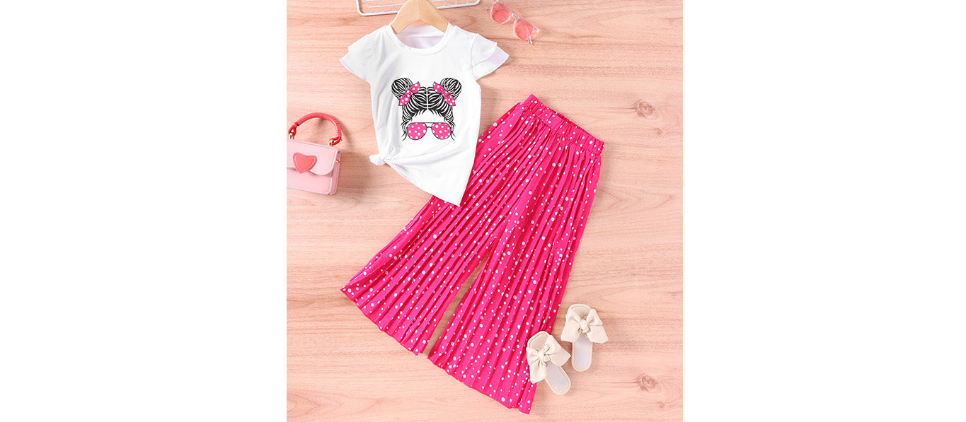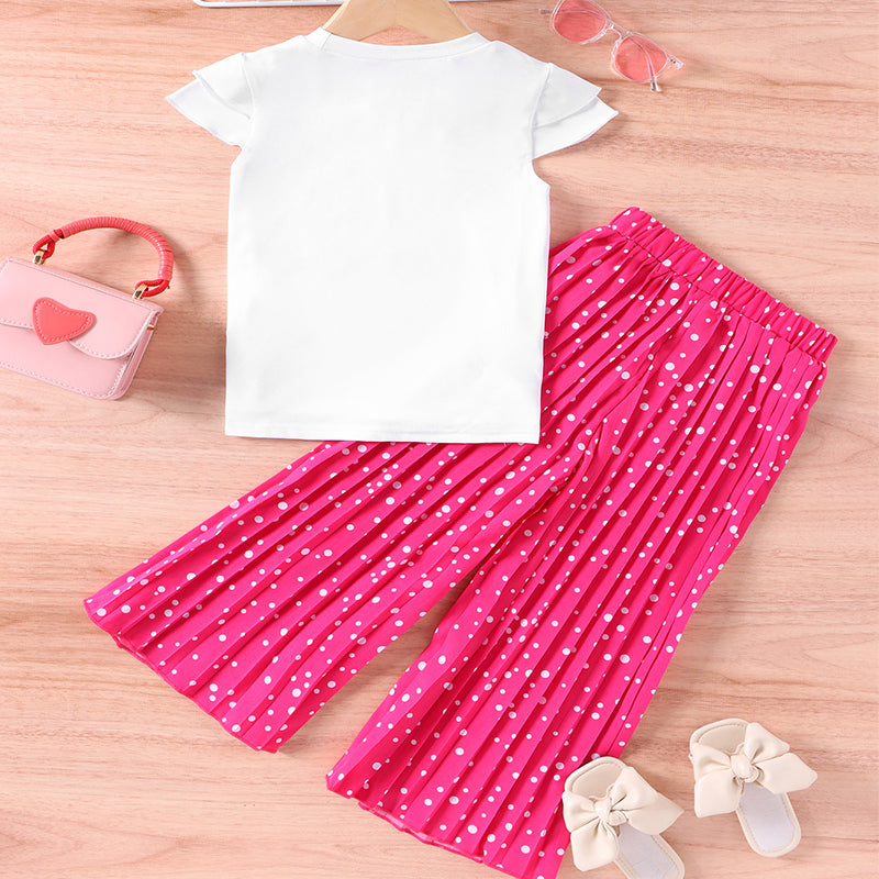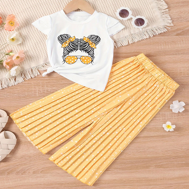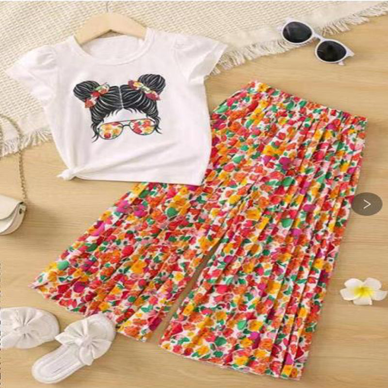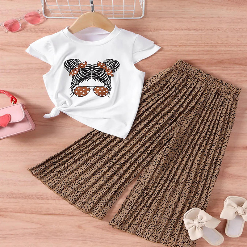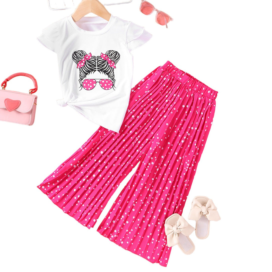 طقم من قطعتين للفتيات يتكون من بلوزة صيفية قصيرة الأكمام وسروال واسع