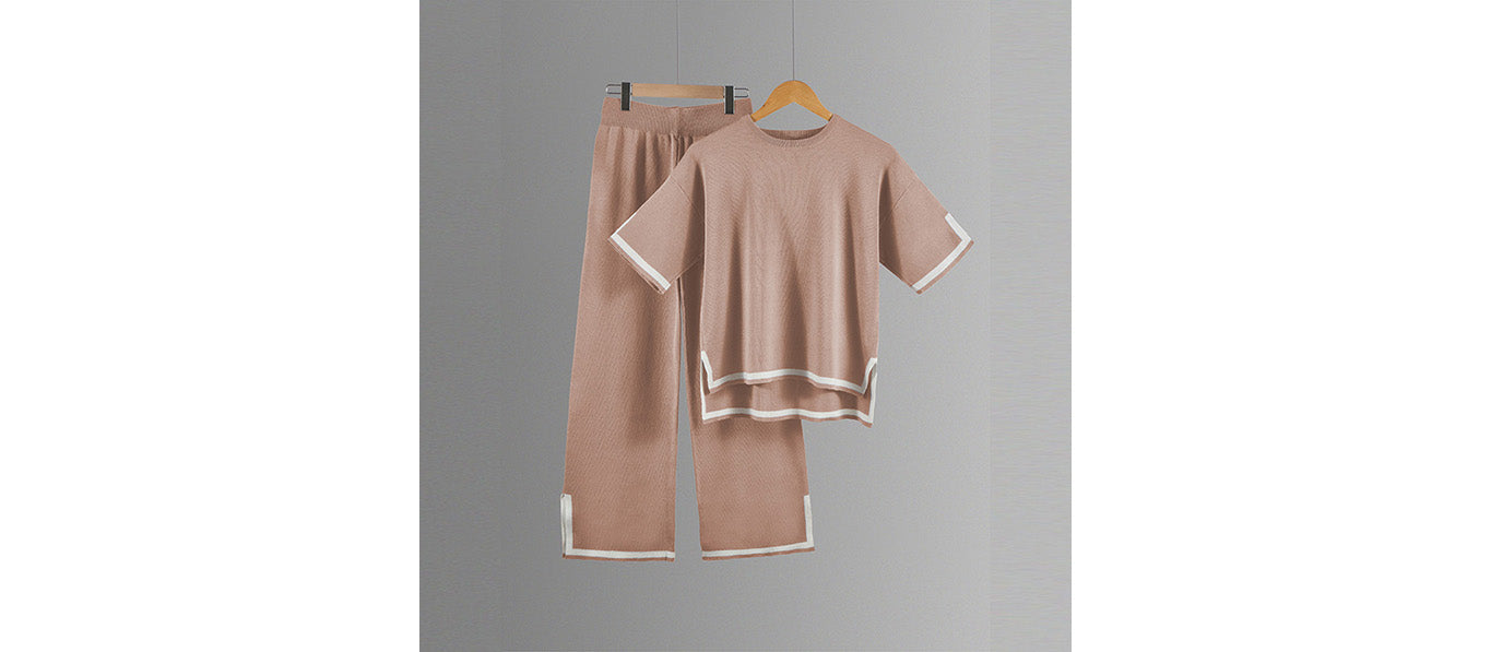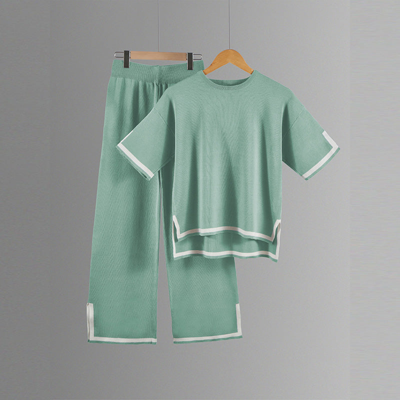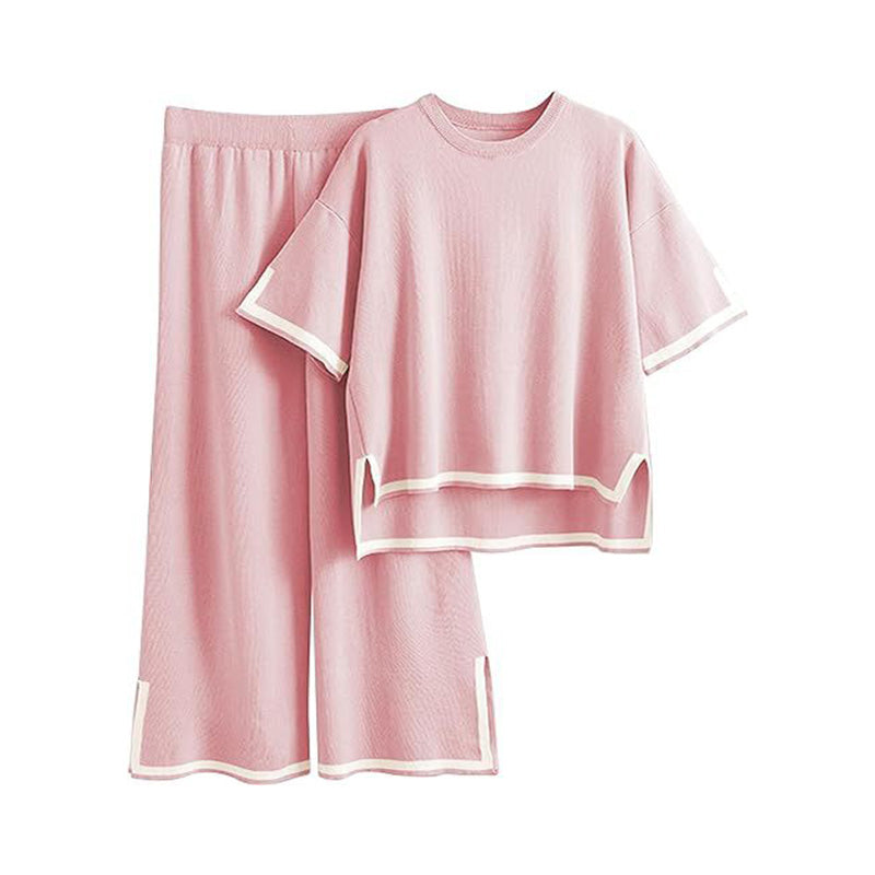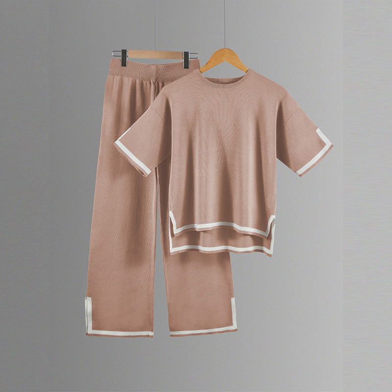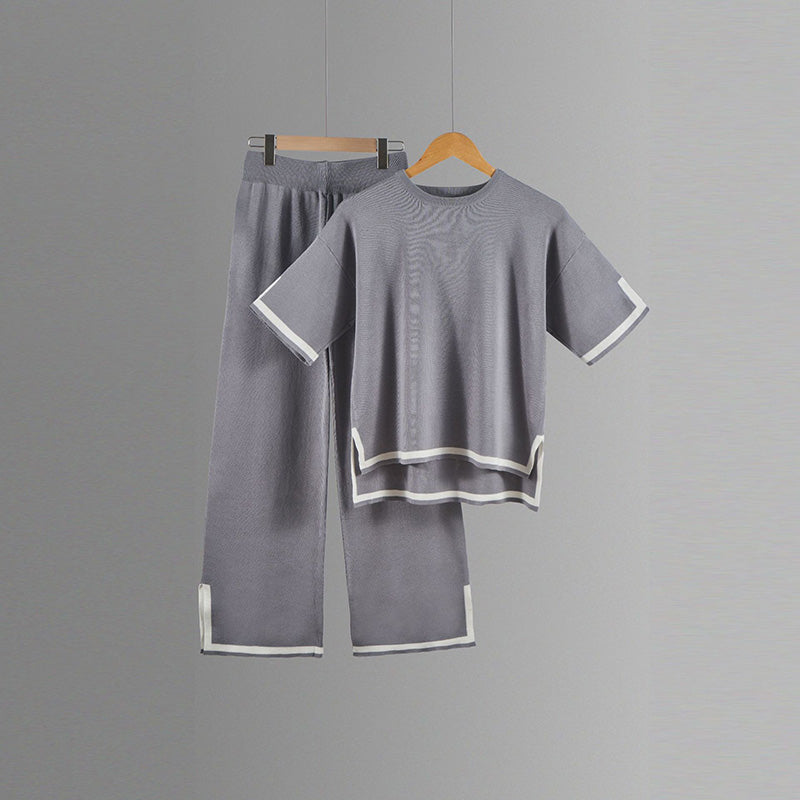 طقم محبوك مع بلوزة قصيرة الأكمام وسروال واسع