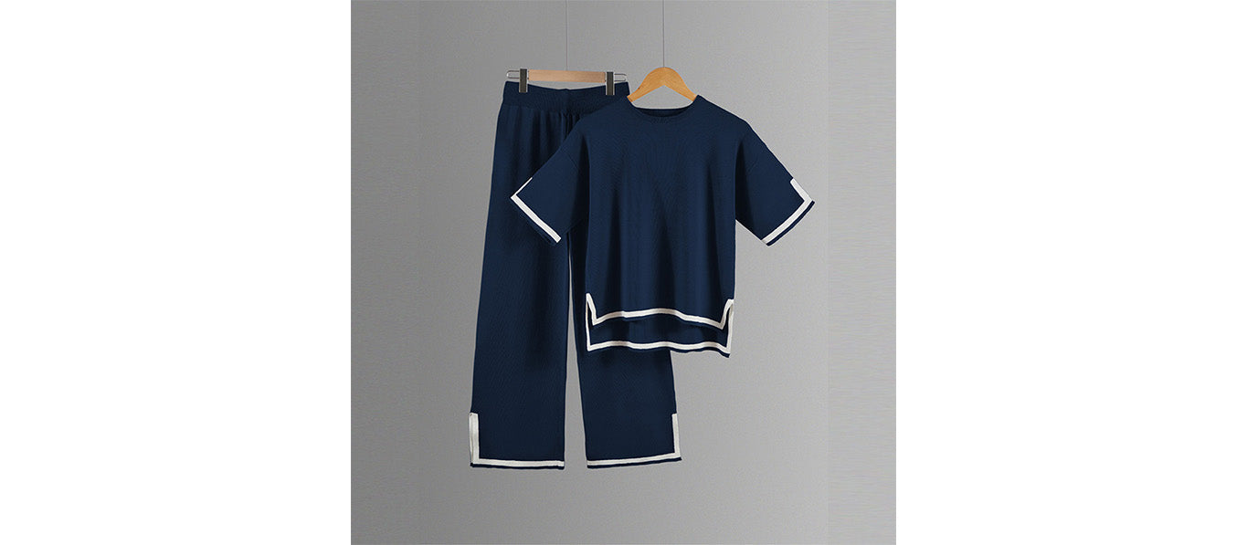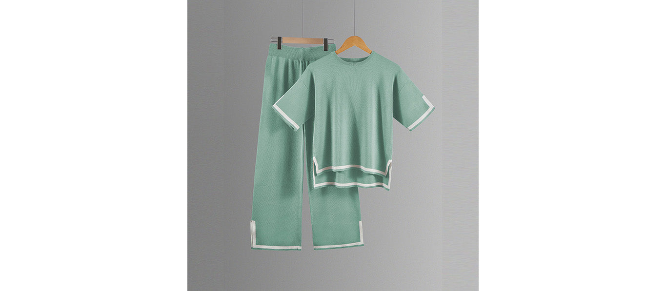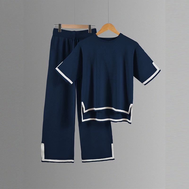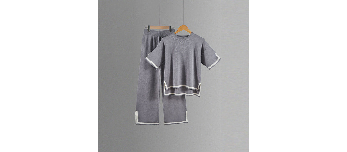 طقم محبوك مع بلوزة قصيرة الأكمام وسروال واسع