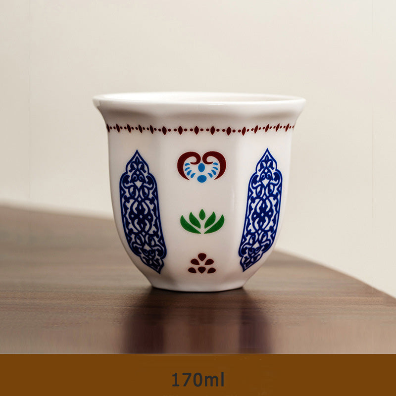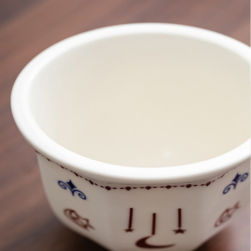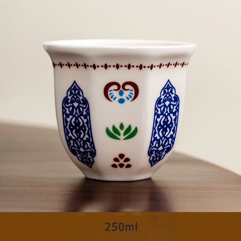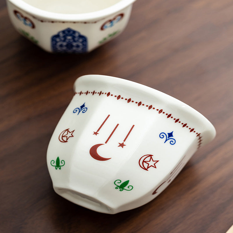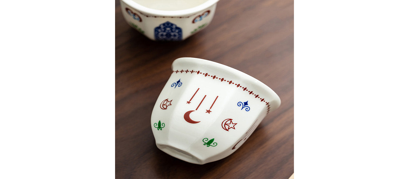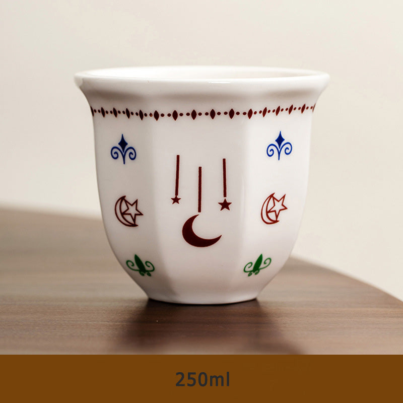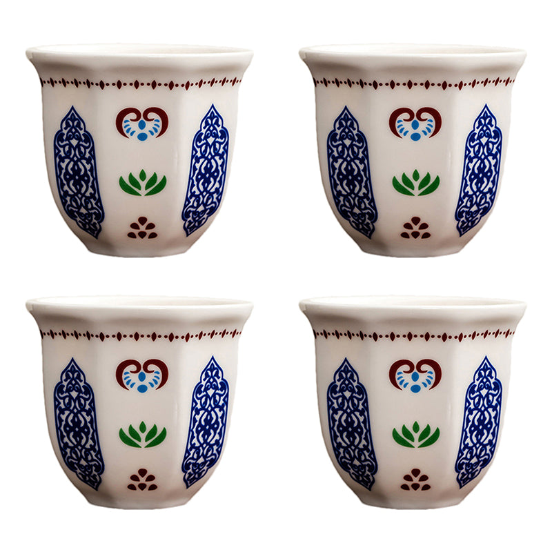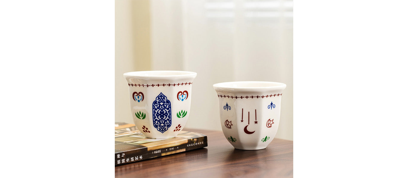 مجموعة من أربعة أكواب قهوة خزفية، سعة كل منها 250 ملليلتر، مزينة بزخارف القمر والنجوم، لتضفي سحرًا عرقيًا أصيلًا.