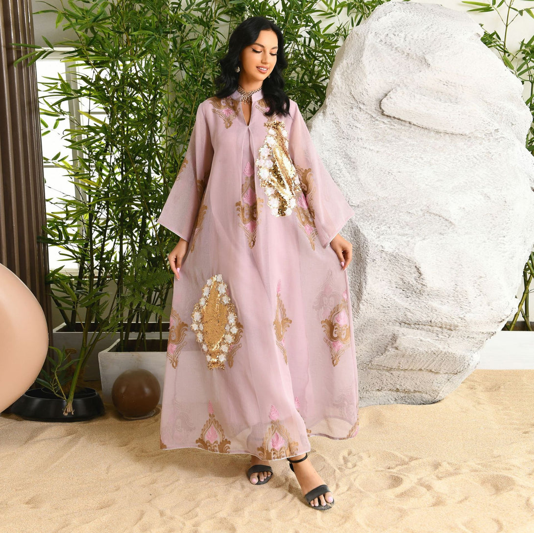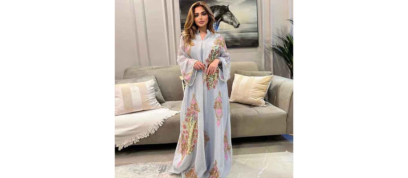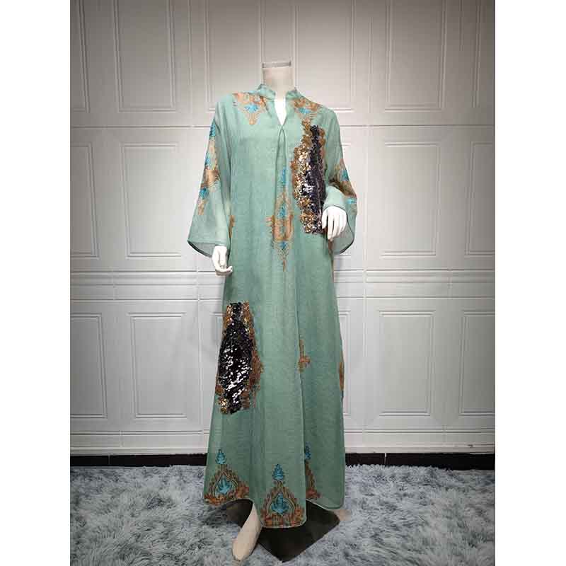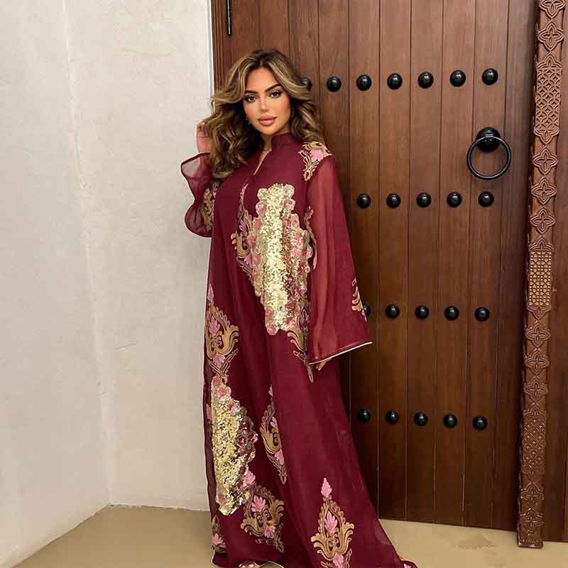 فساتين سهرة نسائية مسلمة فساتين سهرة نسائية مطرزة بالترتر بأكمام طويلة على شكل V