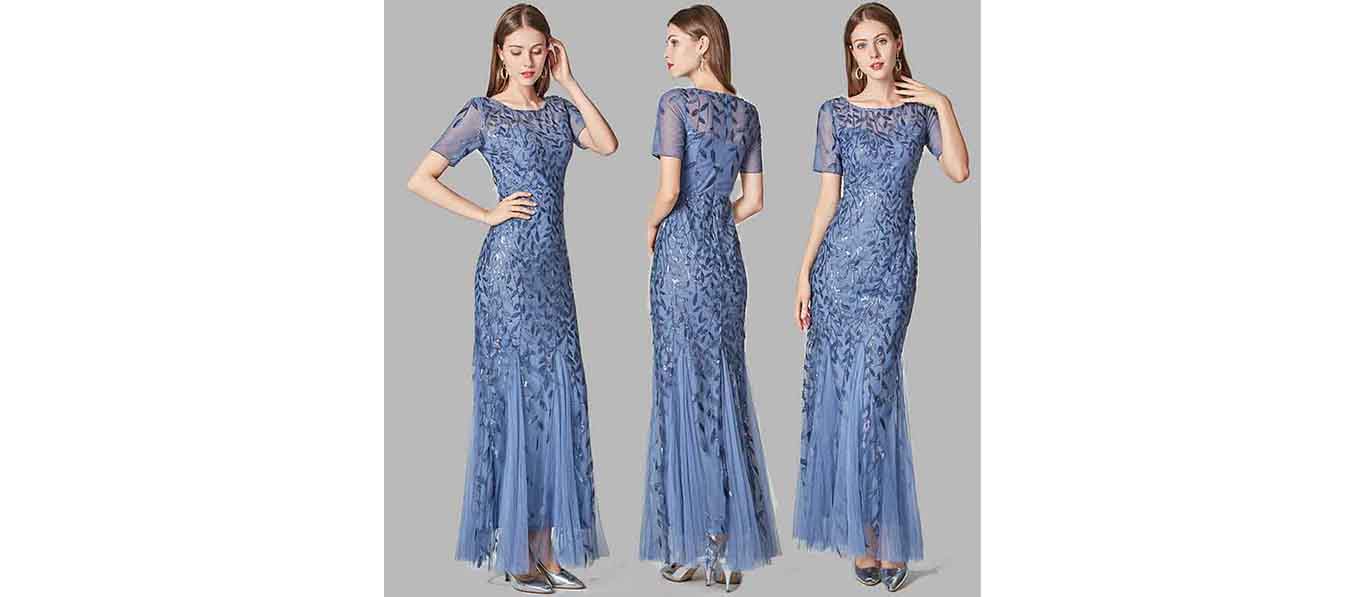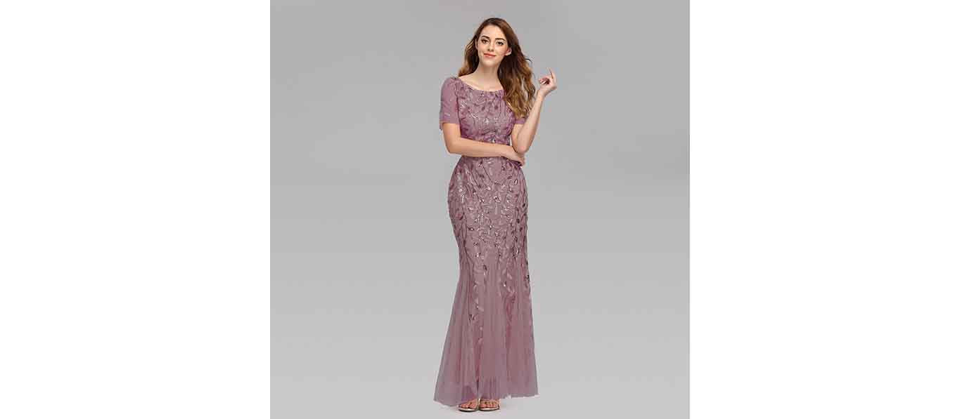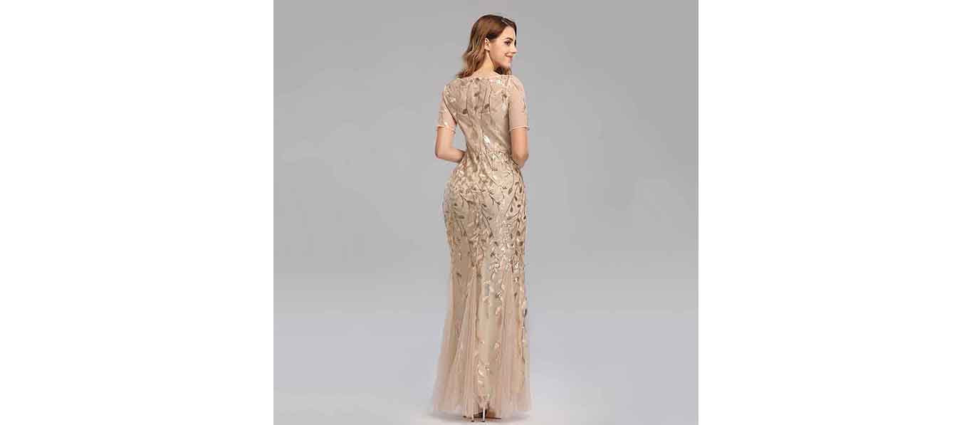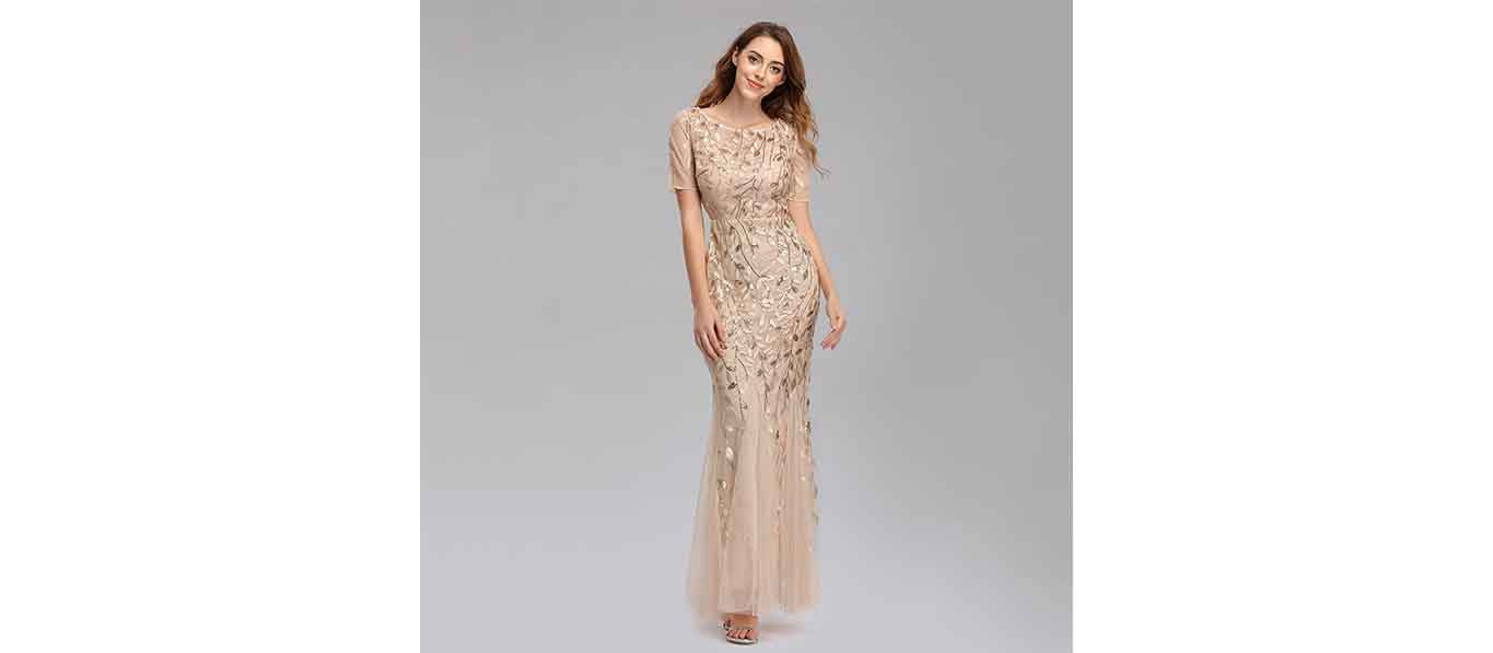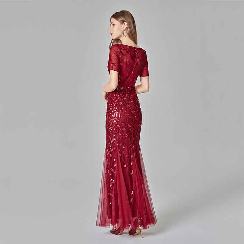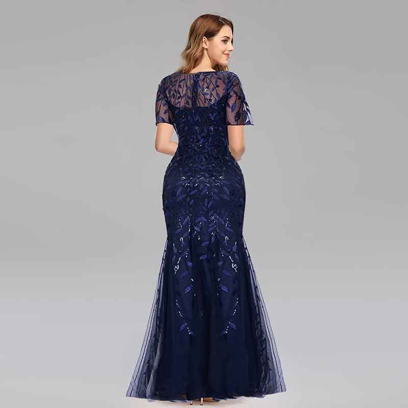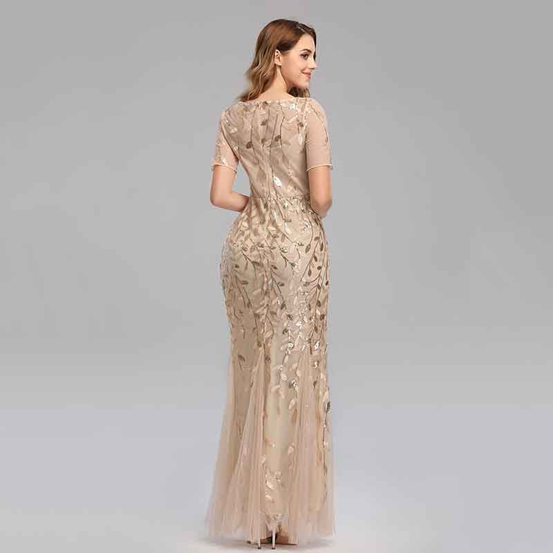 فستان سهرة نسائي مزين بتطريزات دقيقة، بأكمام قصيرة وقصة طويلة.