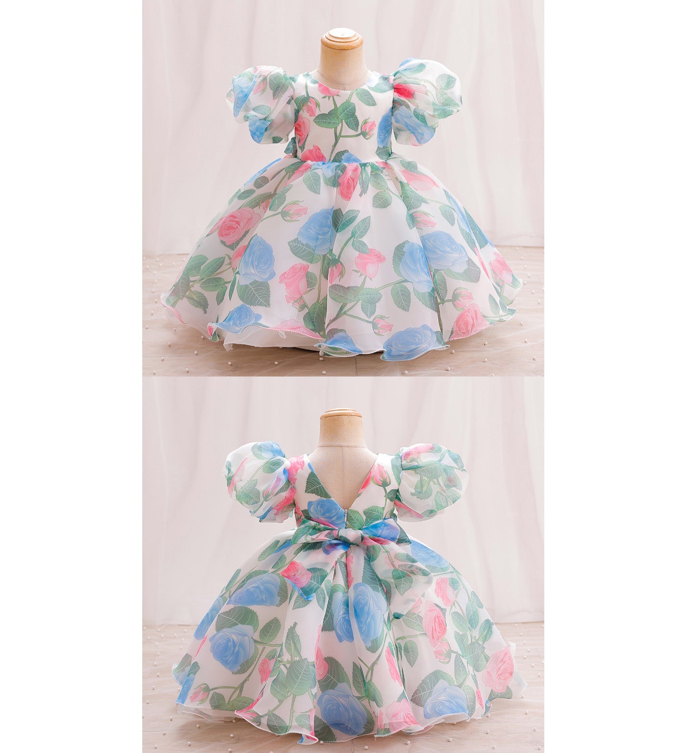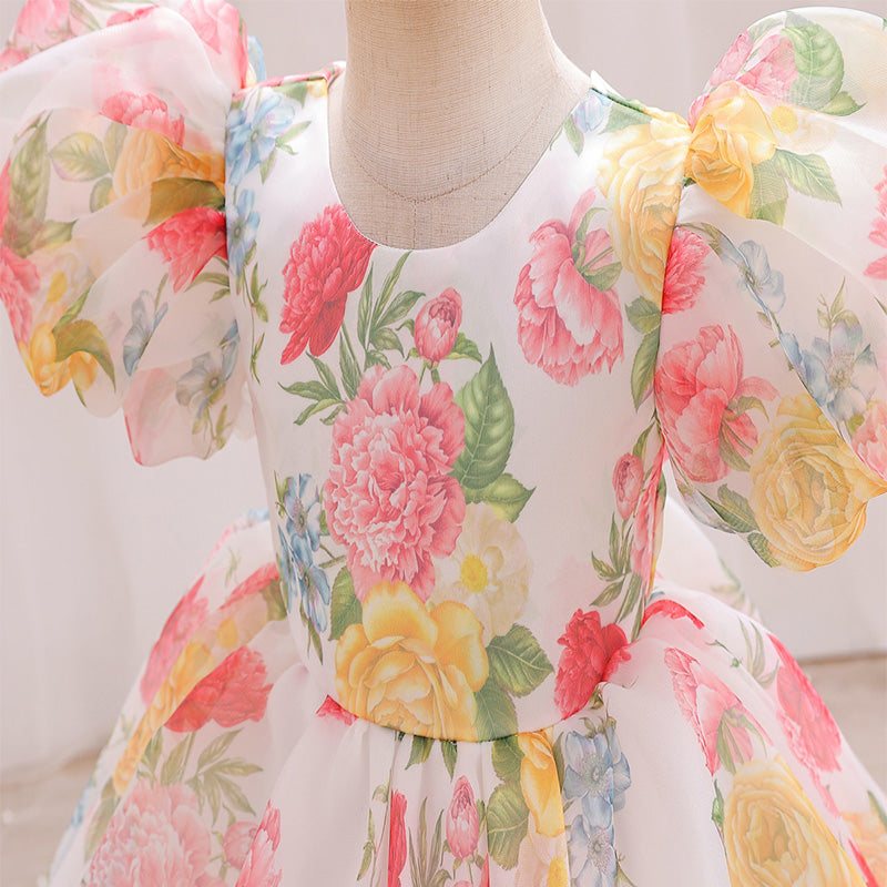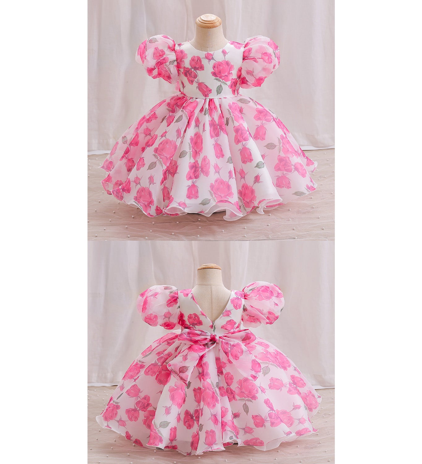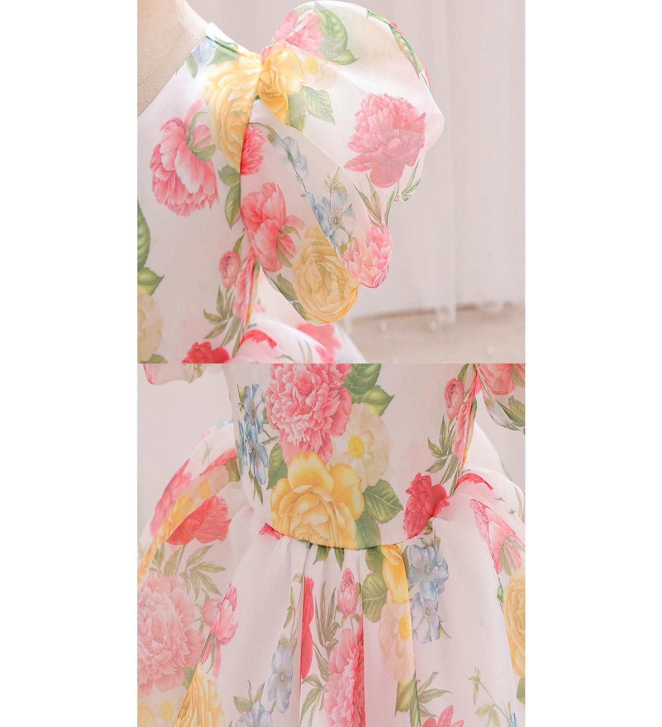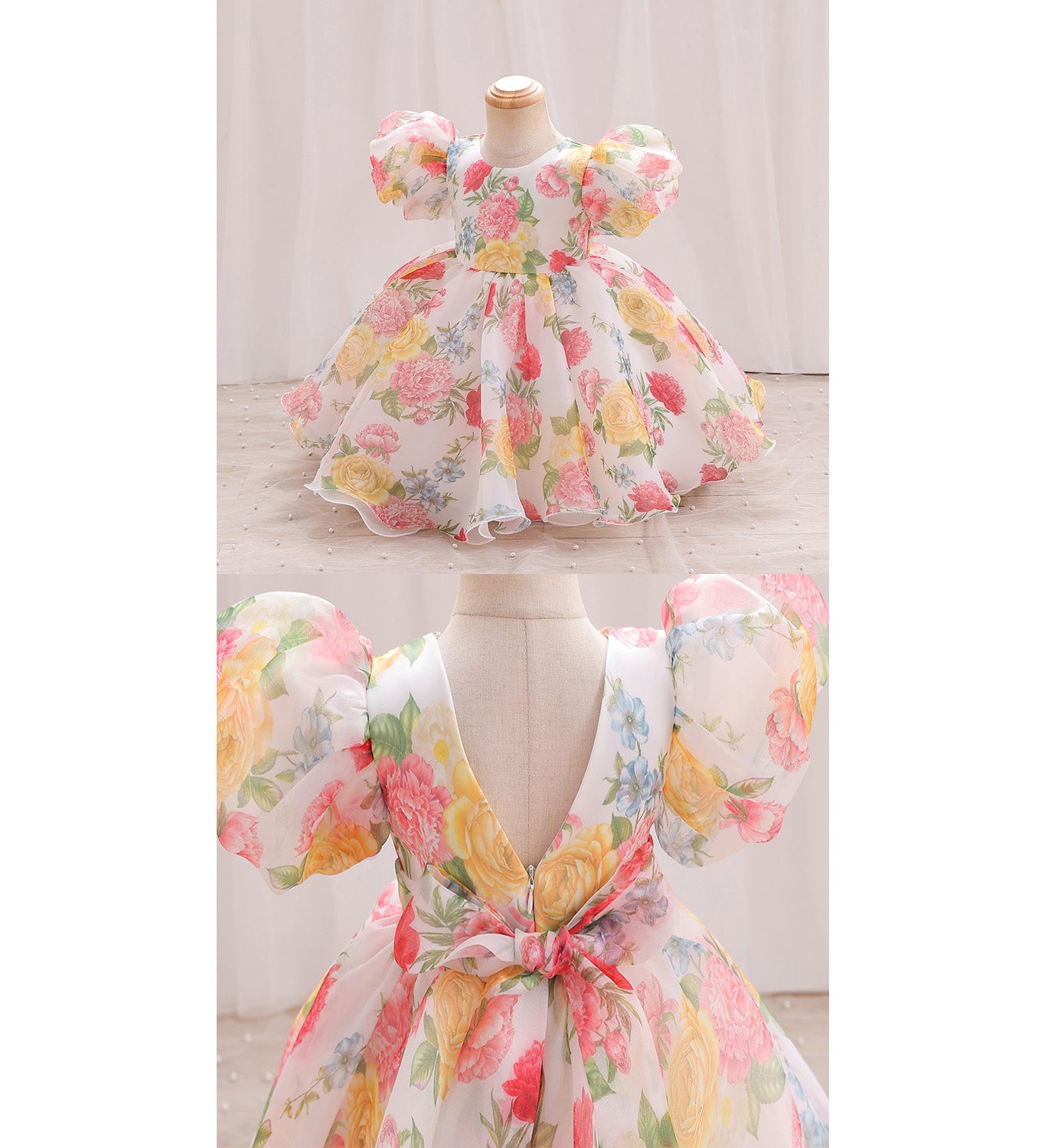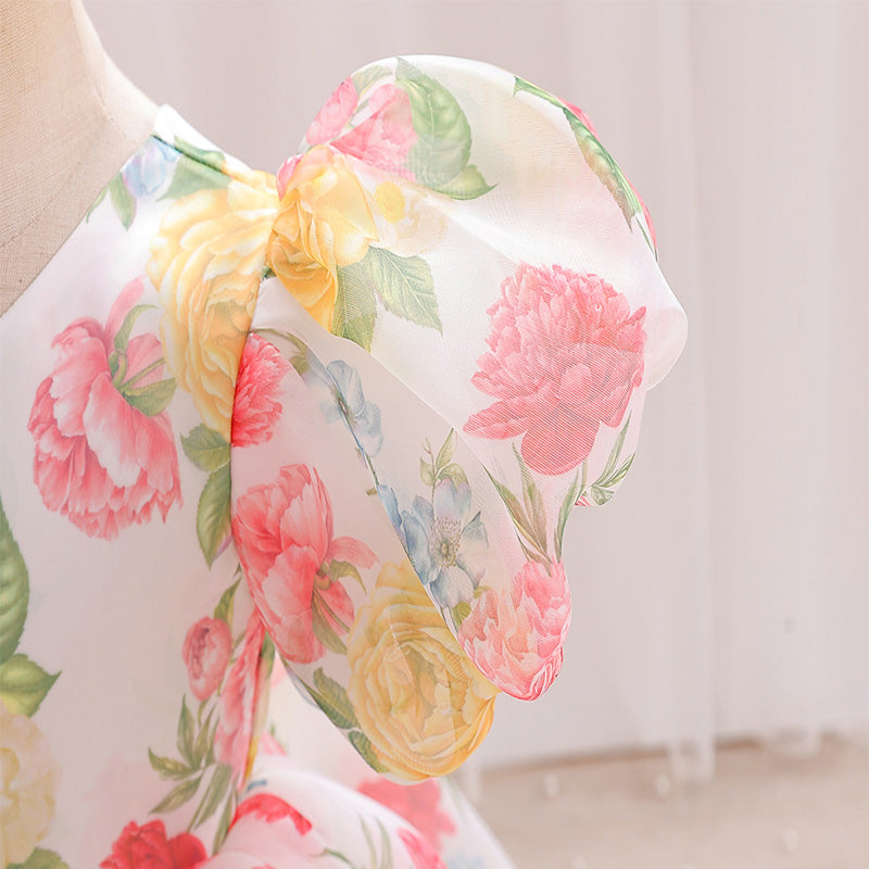 فستان بأكمام قصيرة منفوشة، مزين بنقشة زهور أنيقة تضفي لمسة من الحيوية والنعومة على المظهر العام.