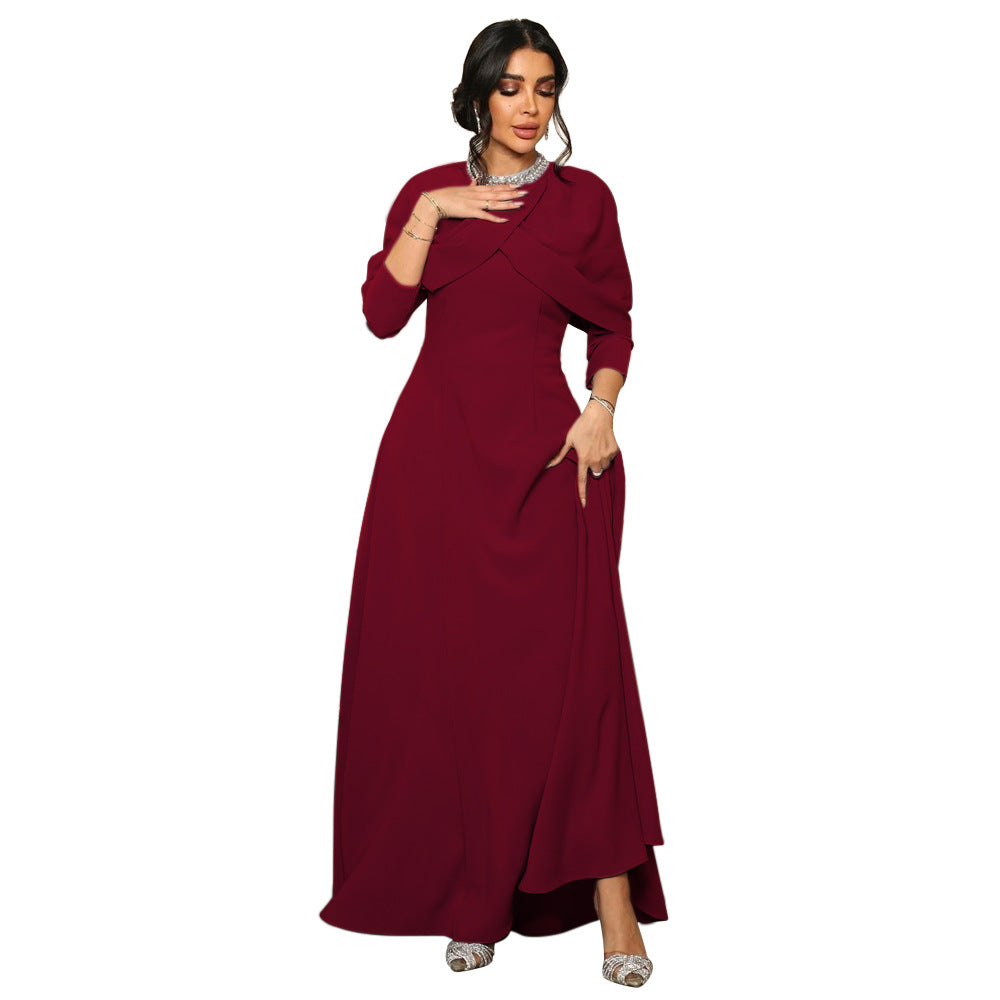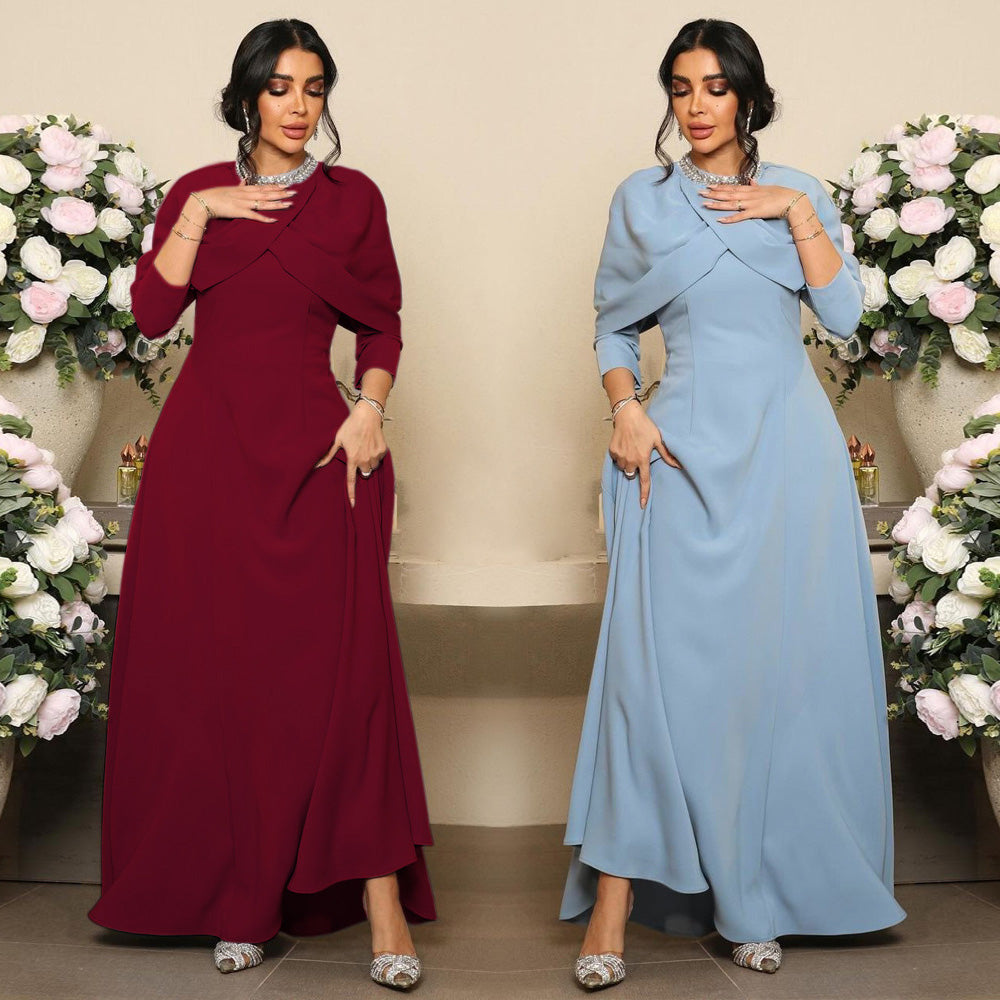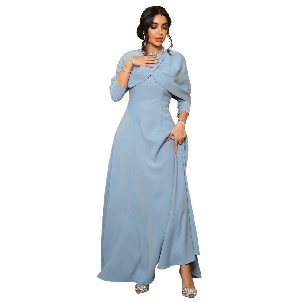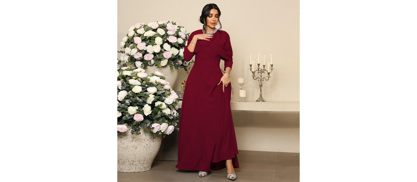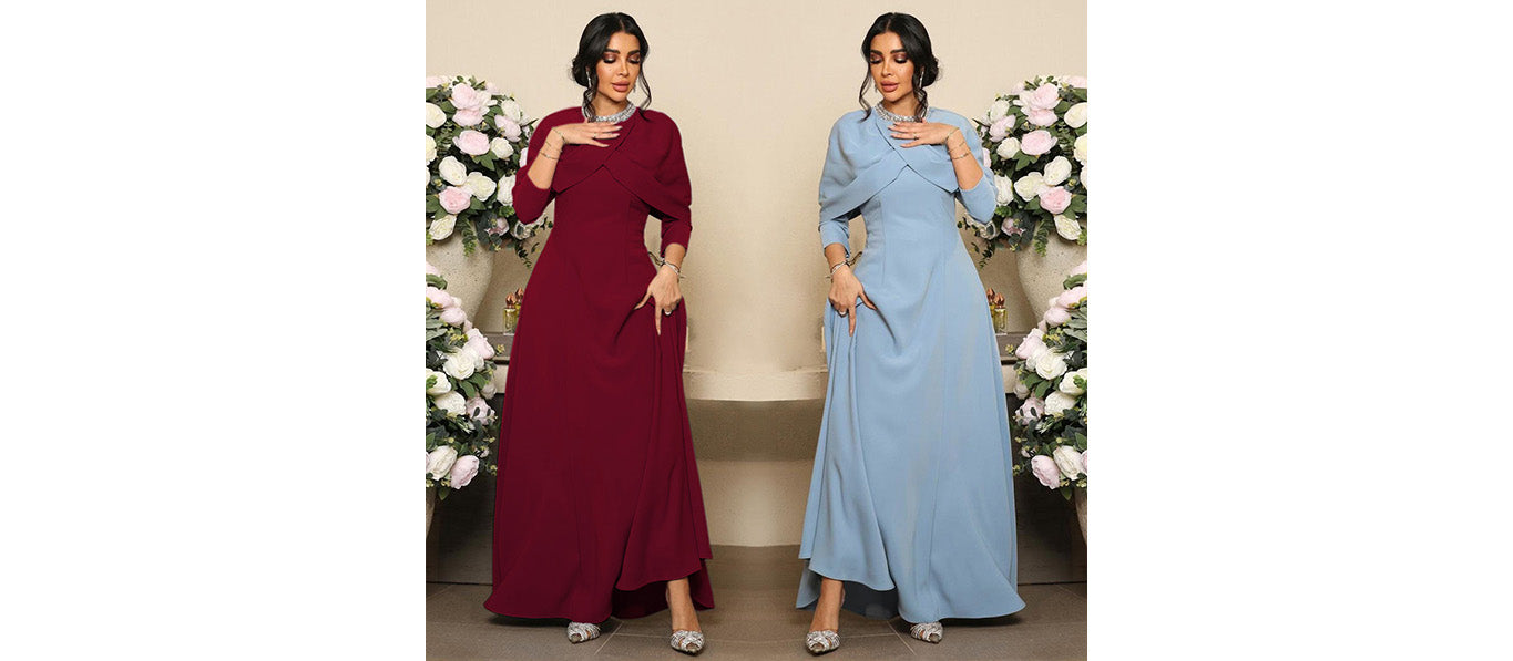 يتميز هذا الفستان الطويل النسائي بياقة أنيقة مزينة بأحجار الراين، مما يضفي لمسة من الفخامة على التصميم.