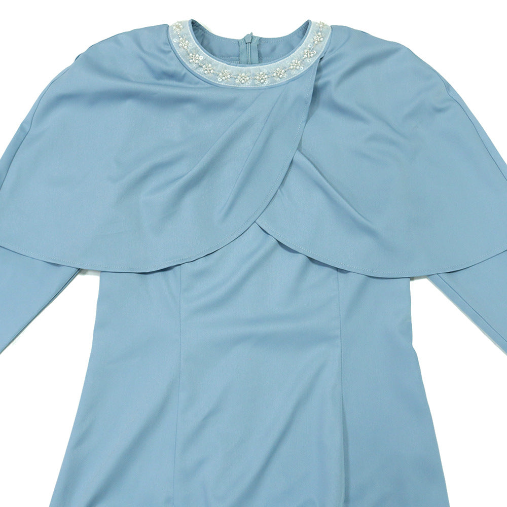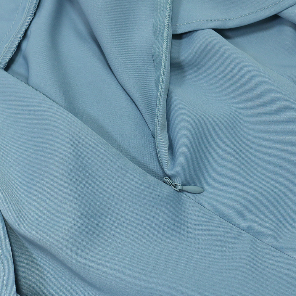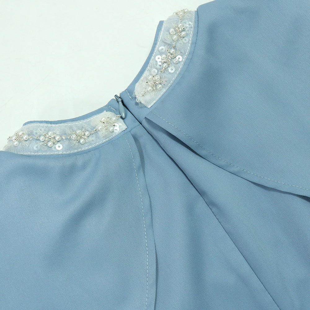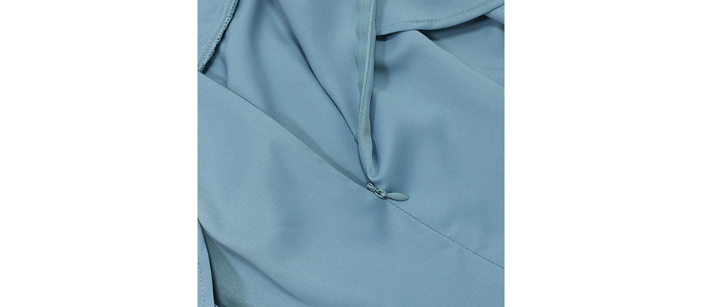يتميز هذا الفستان الطويل النسائي بياقة أنيقة مزينة بأحجار الراين، مما يضفي لمسة من الفخامة على التصميم.