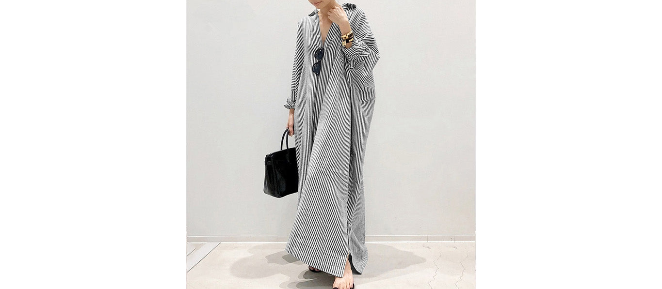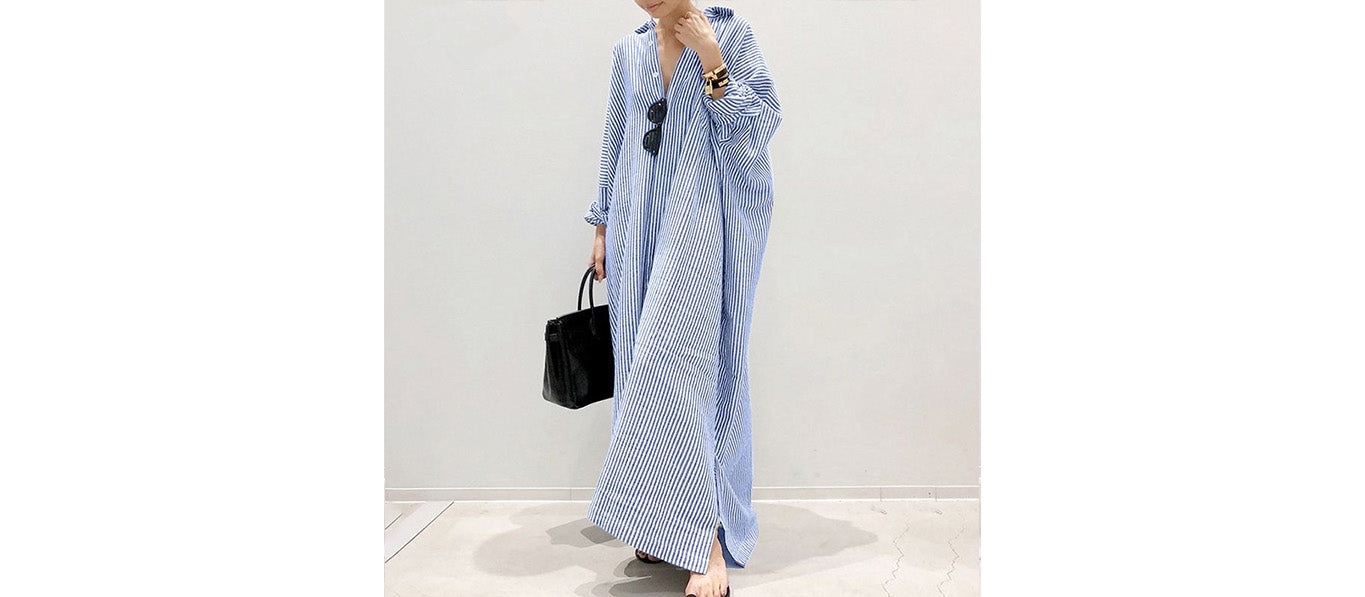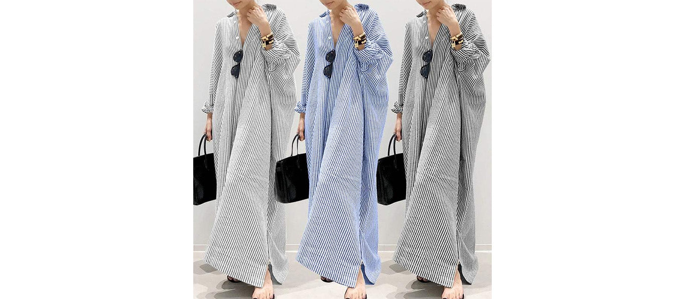 يجمع هذا الفستان النسائي المخطط طويل الأكمام بين الراحة والأناقة في تصميم عملي وعصري، وهو مصنوع من قماش قطني ناعم.