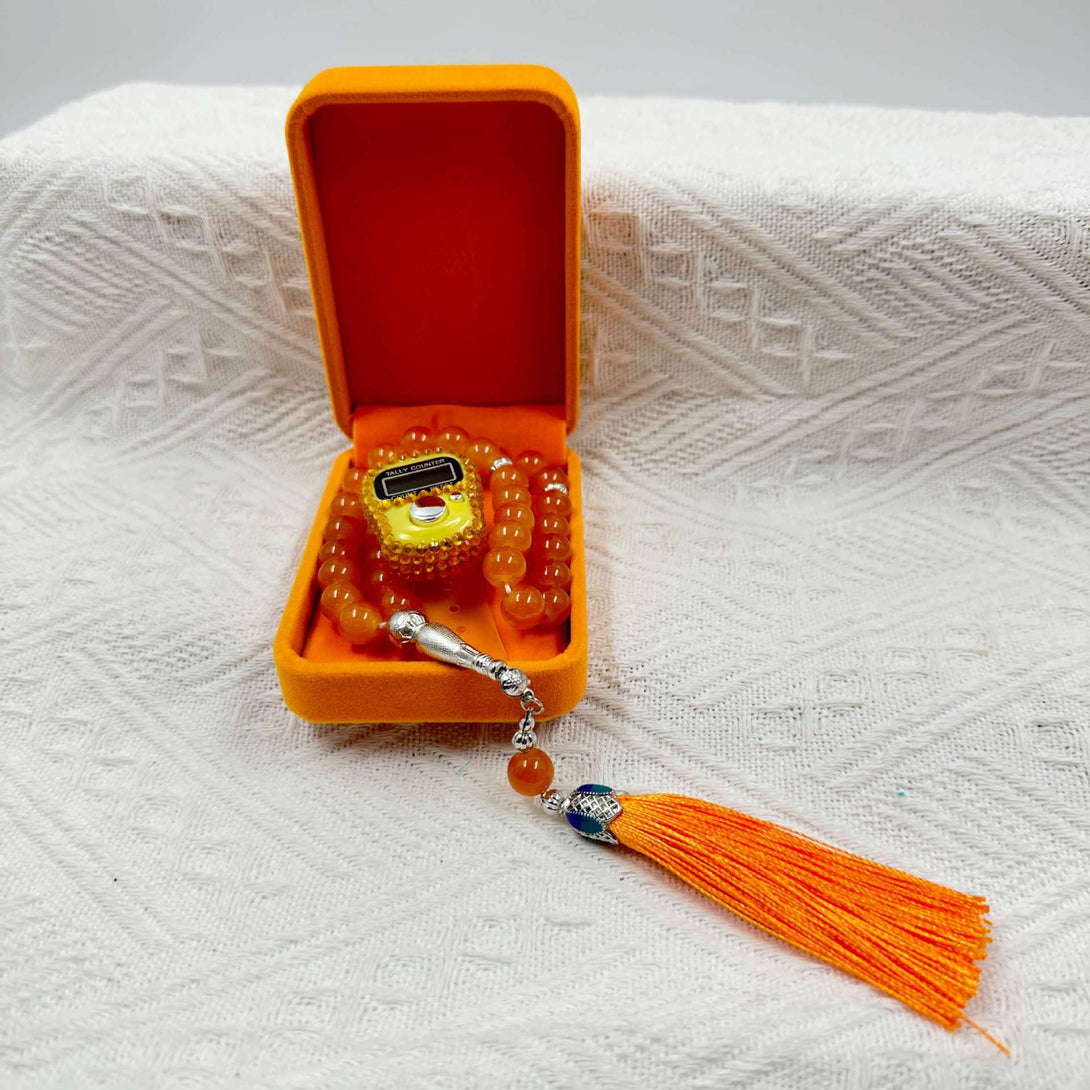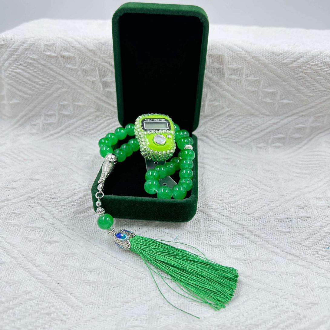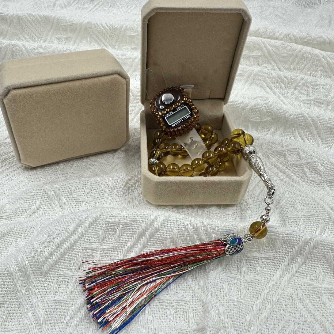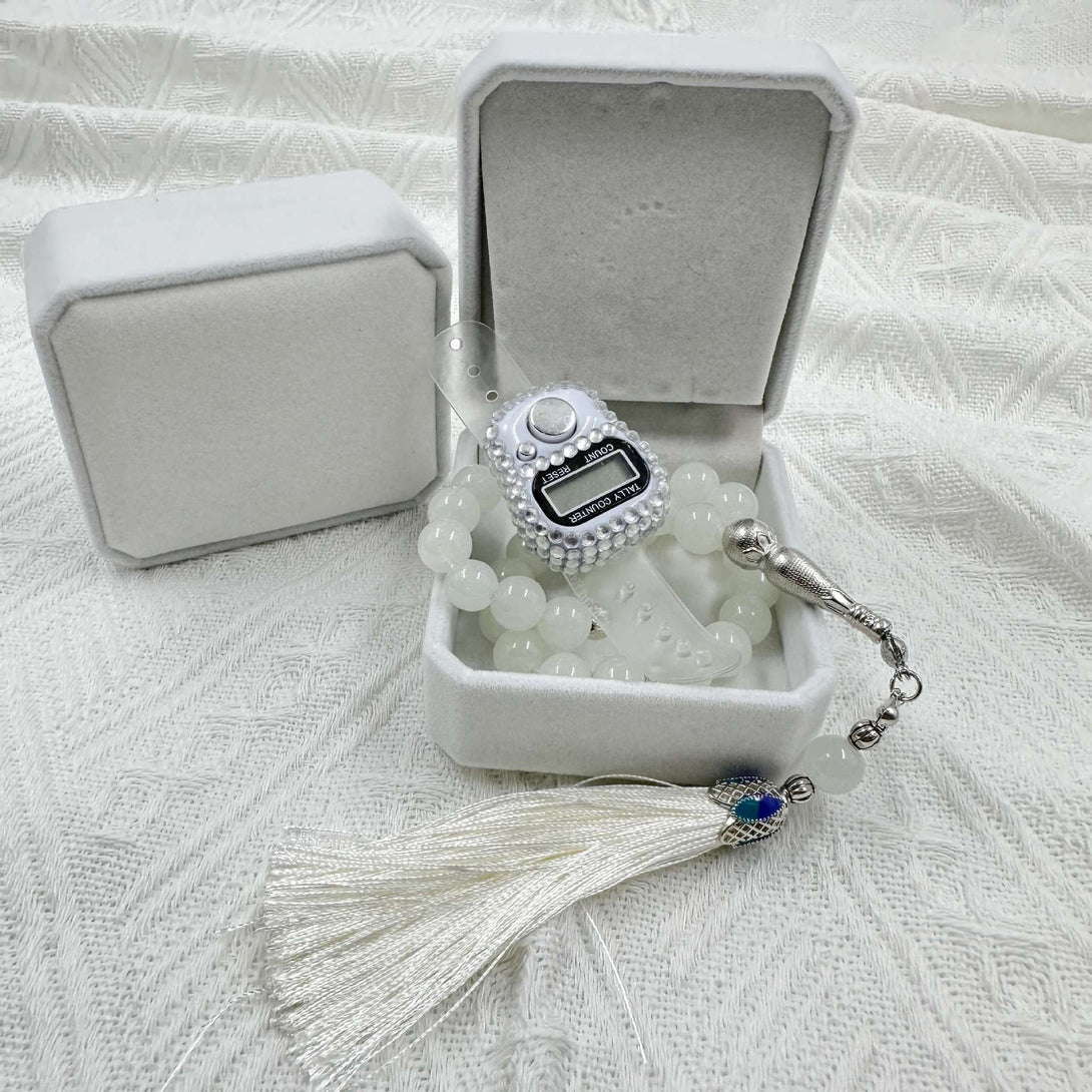 تتكون هذه المجموعة المميزة من مسبحة من 33 حبة زجاجية، يبلغ قطر كل منها 10 سنتيمترات، مصنوعة بدقة لتوفير تجربة عبادة مريحة وفريدة من نوعها.