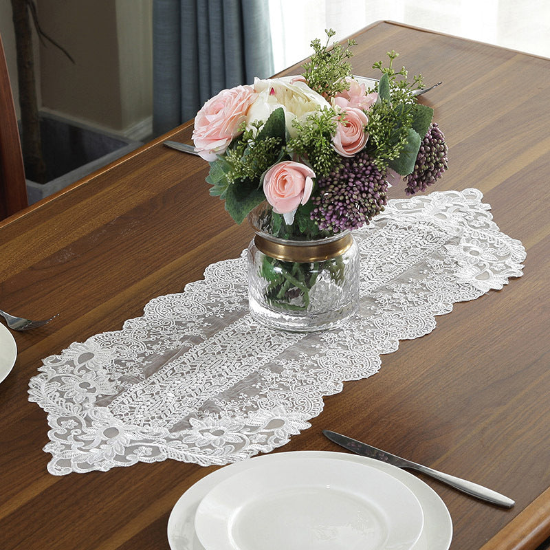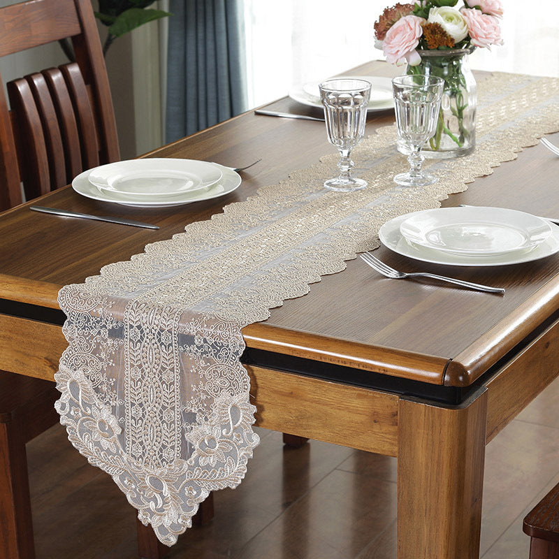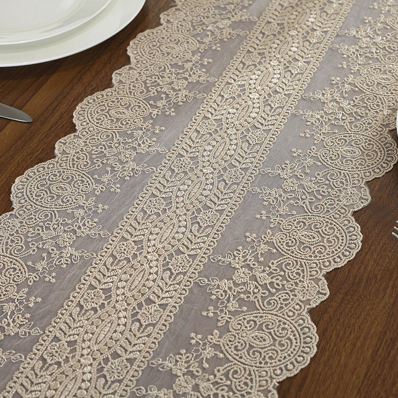 مفرش طاولة أبيض / شمبانيا من الدانتيل مفرش طاولة مطرز بمكرميه رائع وشالات مفرش طاولة