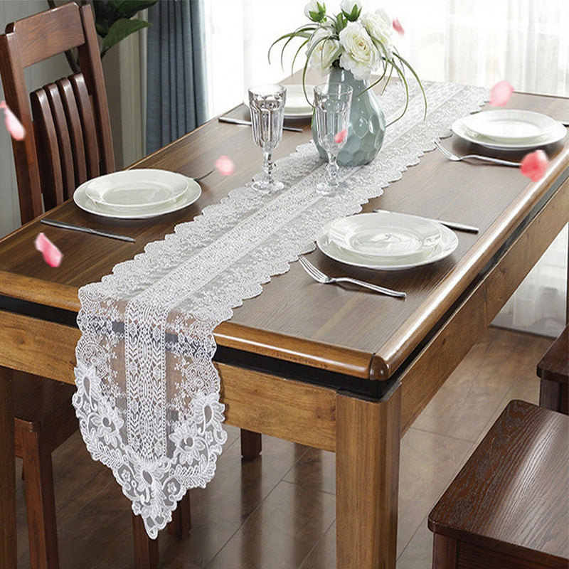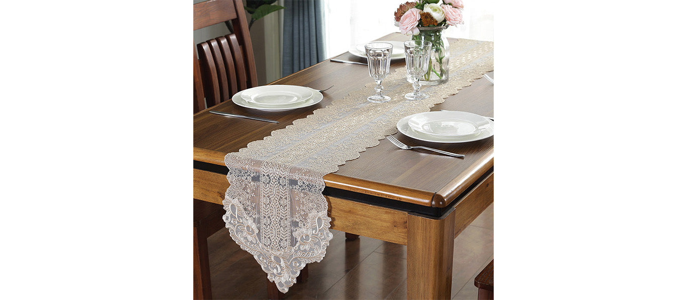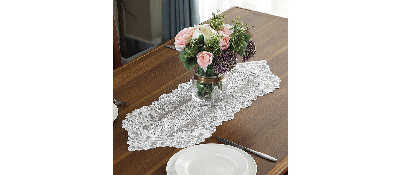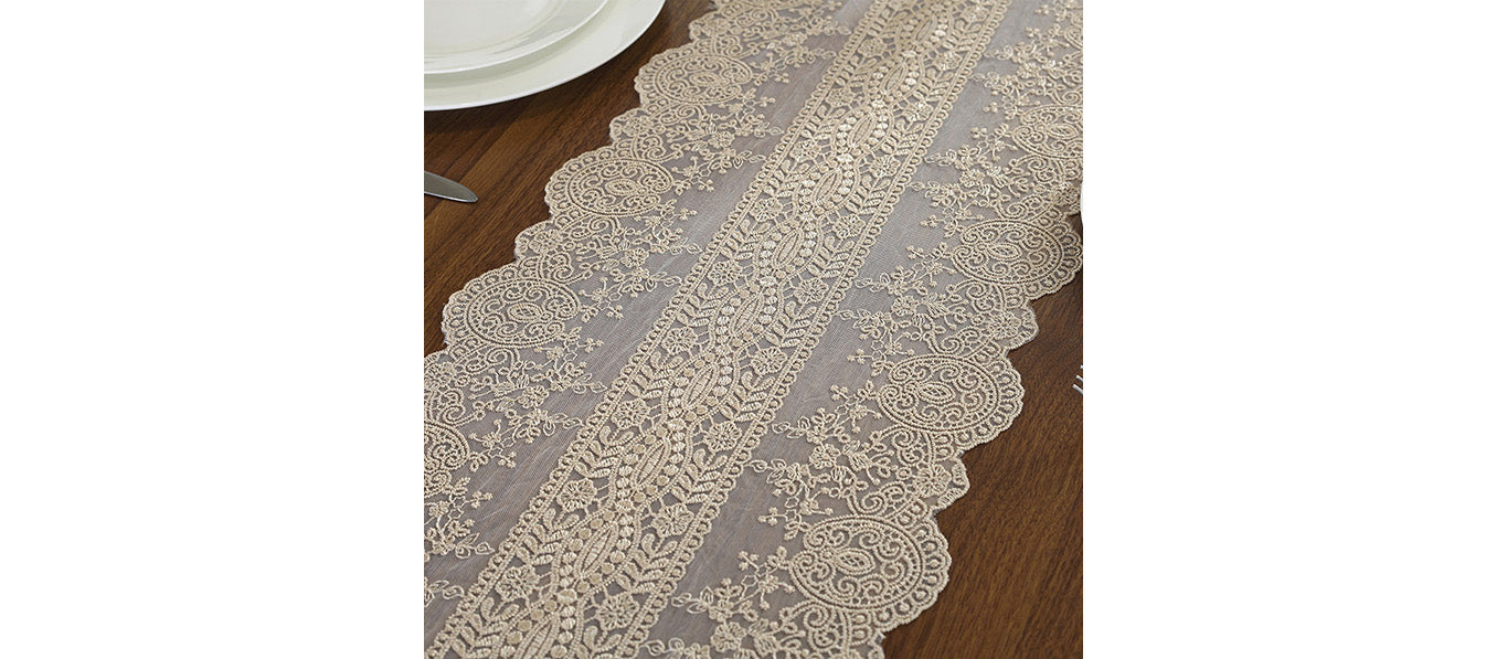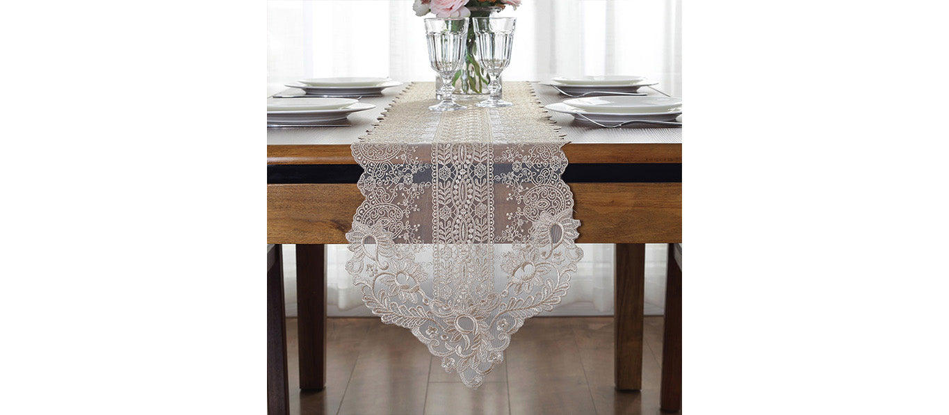تتميز مفرش المائدة المصنوع من الدانتيل الأبيض بلون الشمبانيا بنسيج فاخر، مما يضفي جواً من الرقي على أي طاولة طعام. ويبرز التطريز المعقد التفاصيل الفنية، مما يرفع من الجاذبية الجمالية للتصميم، ويجعله خياراً مثالياً للمناسبات الخاصة والديكورات الراقية.