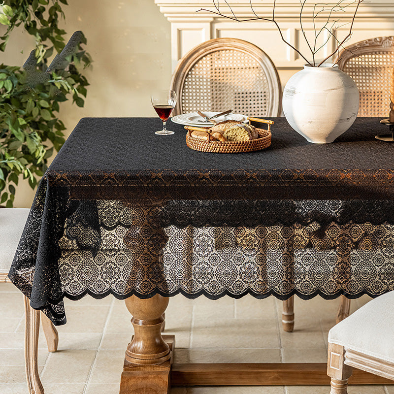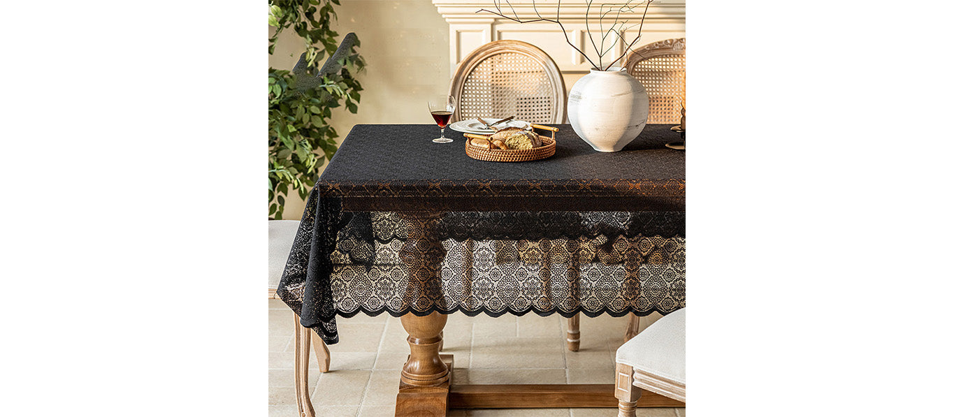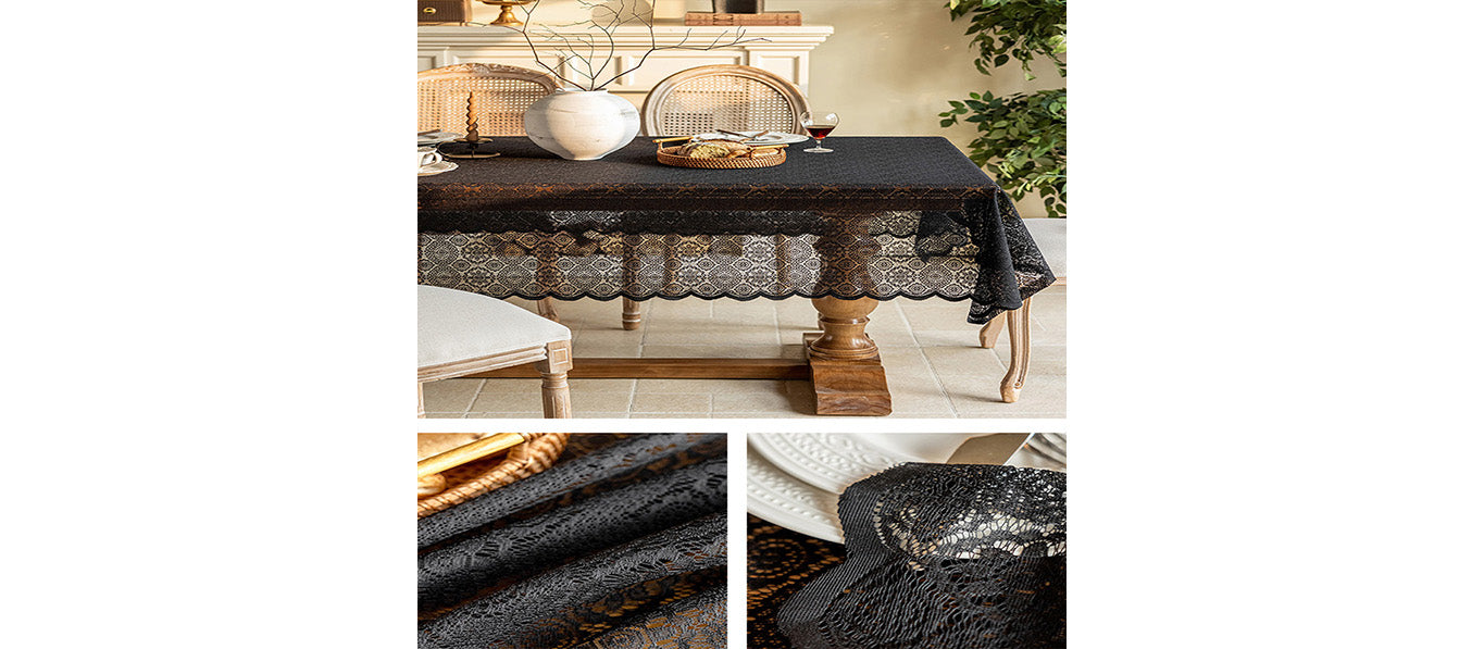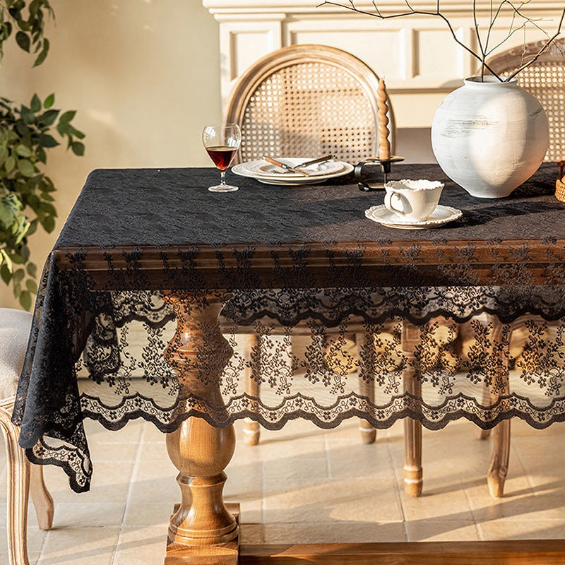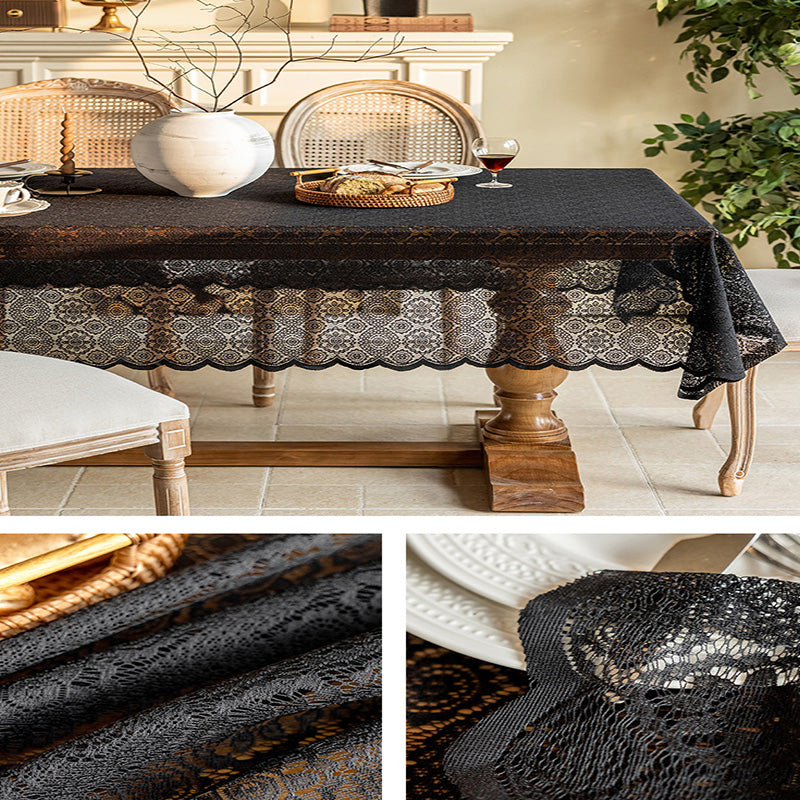 مفرش طاولة أبيض وأسود من الدانتيل مع تطريز