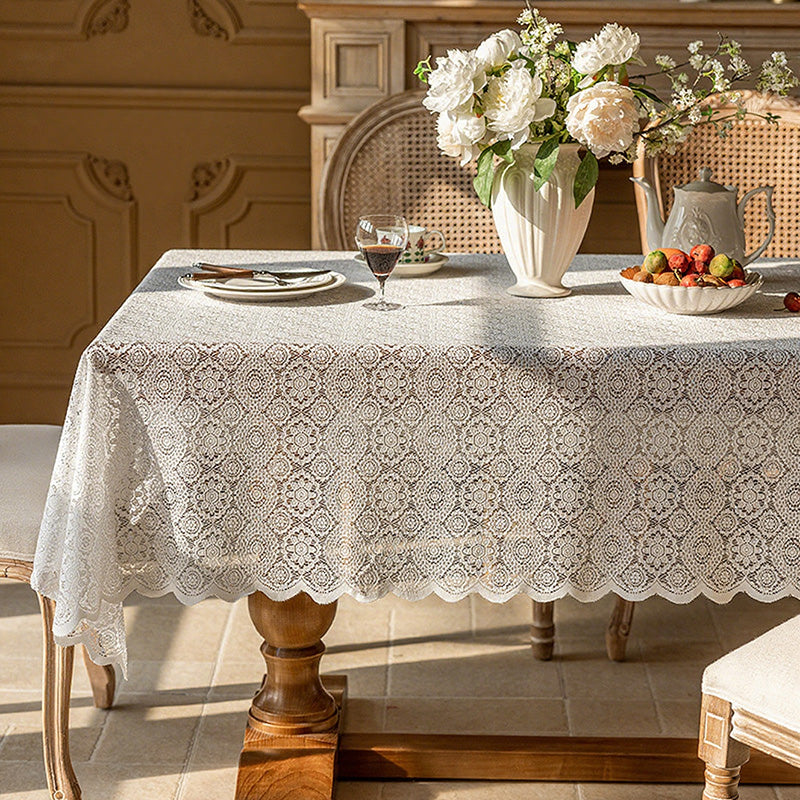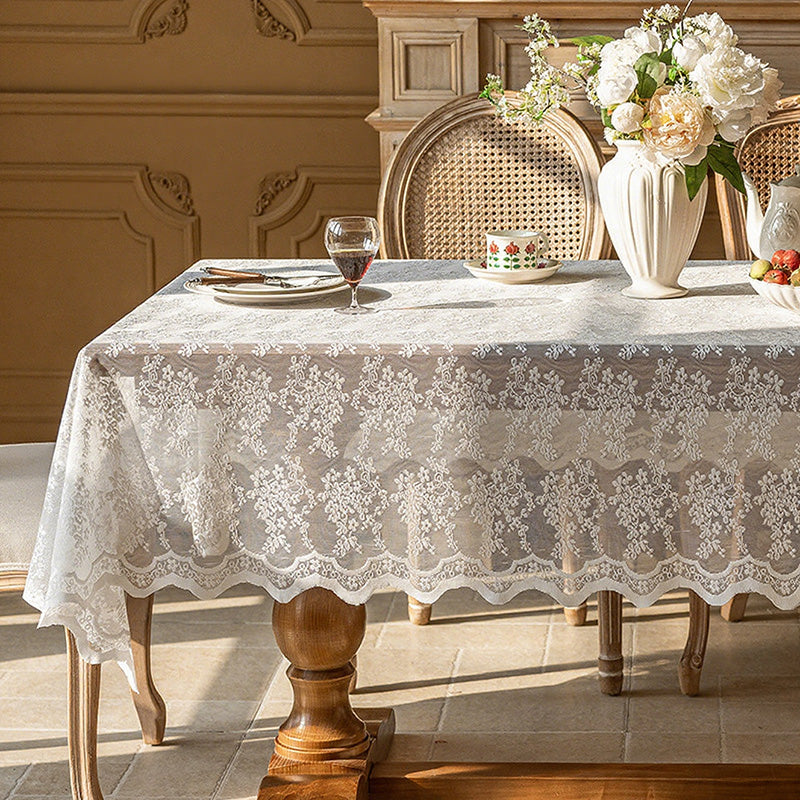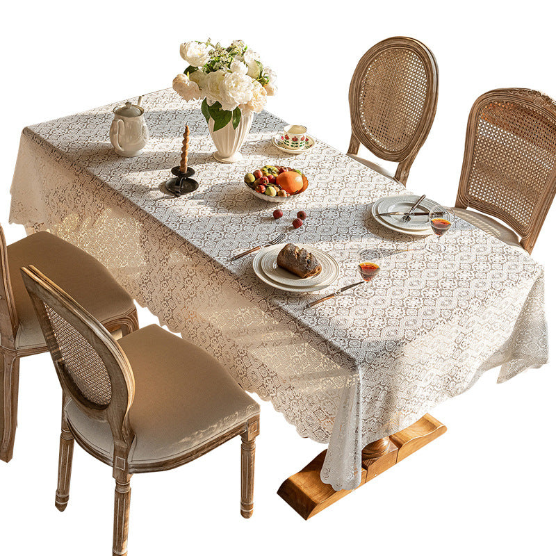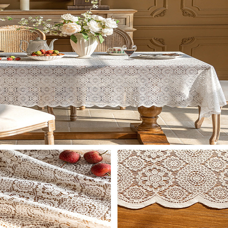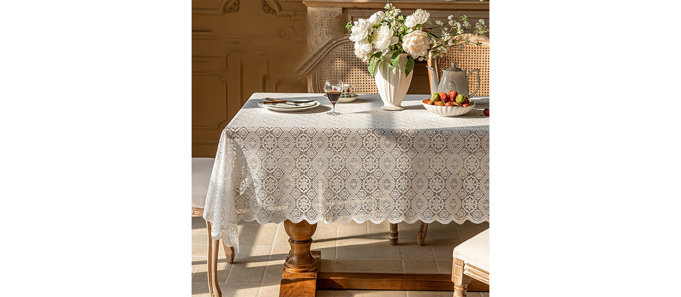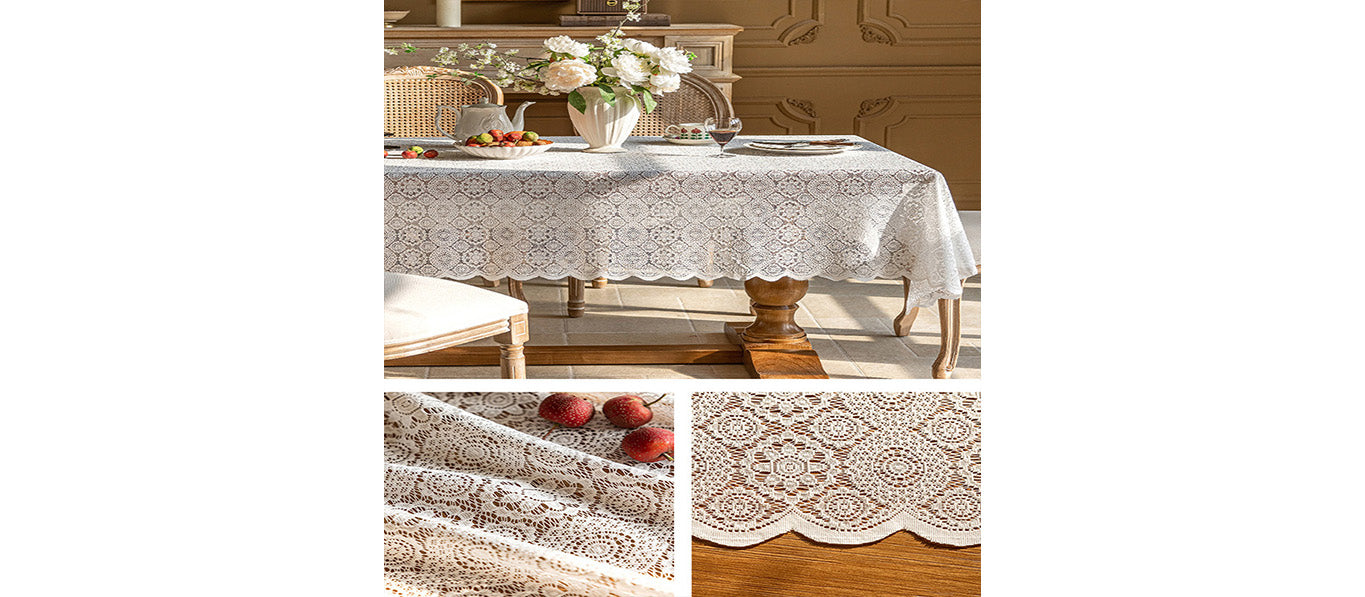 مفرش طاولة أبيض وأسود من الدانتيل مع تطريز