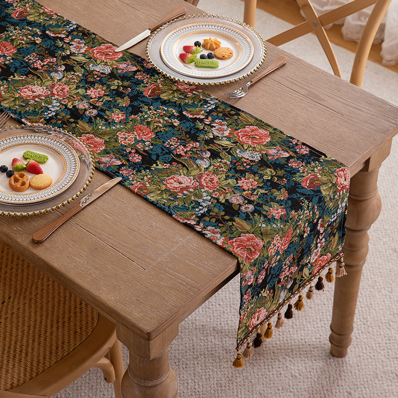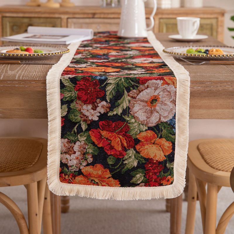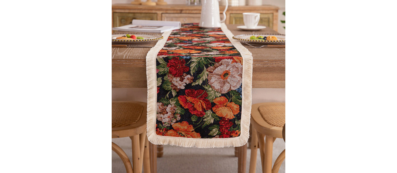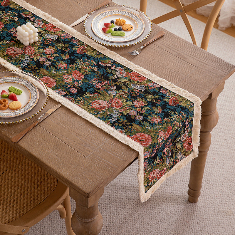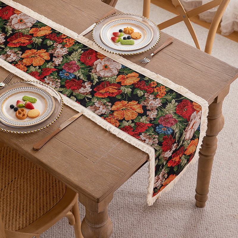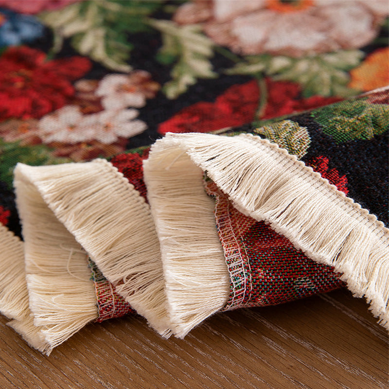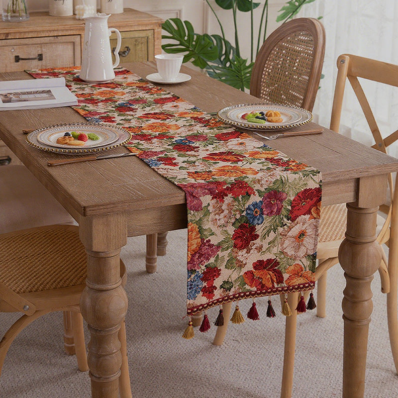 مفرش طاولة زهور عتيق مصبوغ بالألوان المائية وشاح طاولة زهور مع شرابات وأهداب