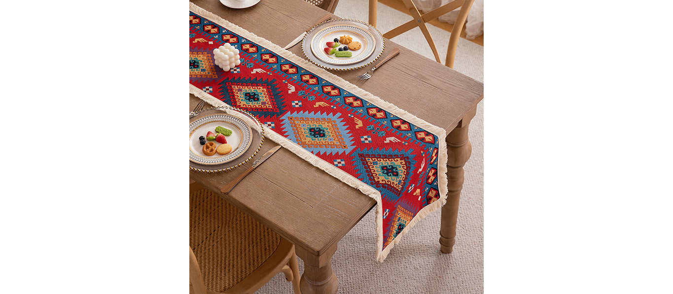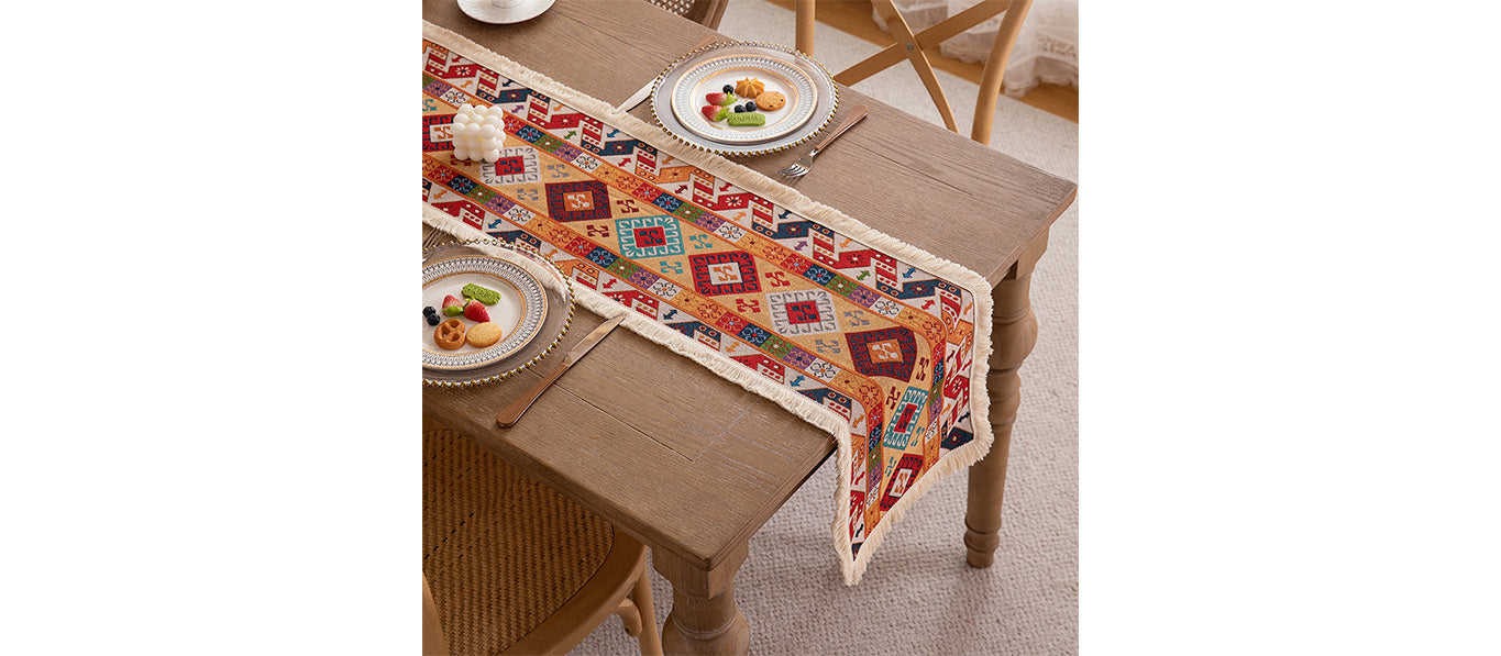 مفرش المائدة مزين بنقوش زهرية مرسومة بالألوان المائية ويتميز بزخارف.