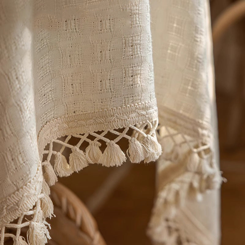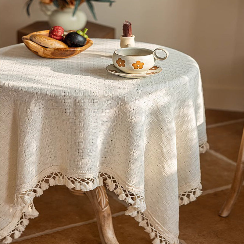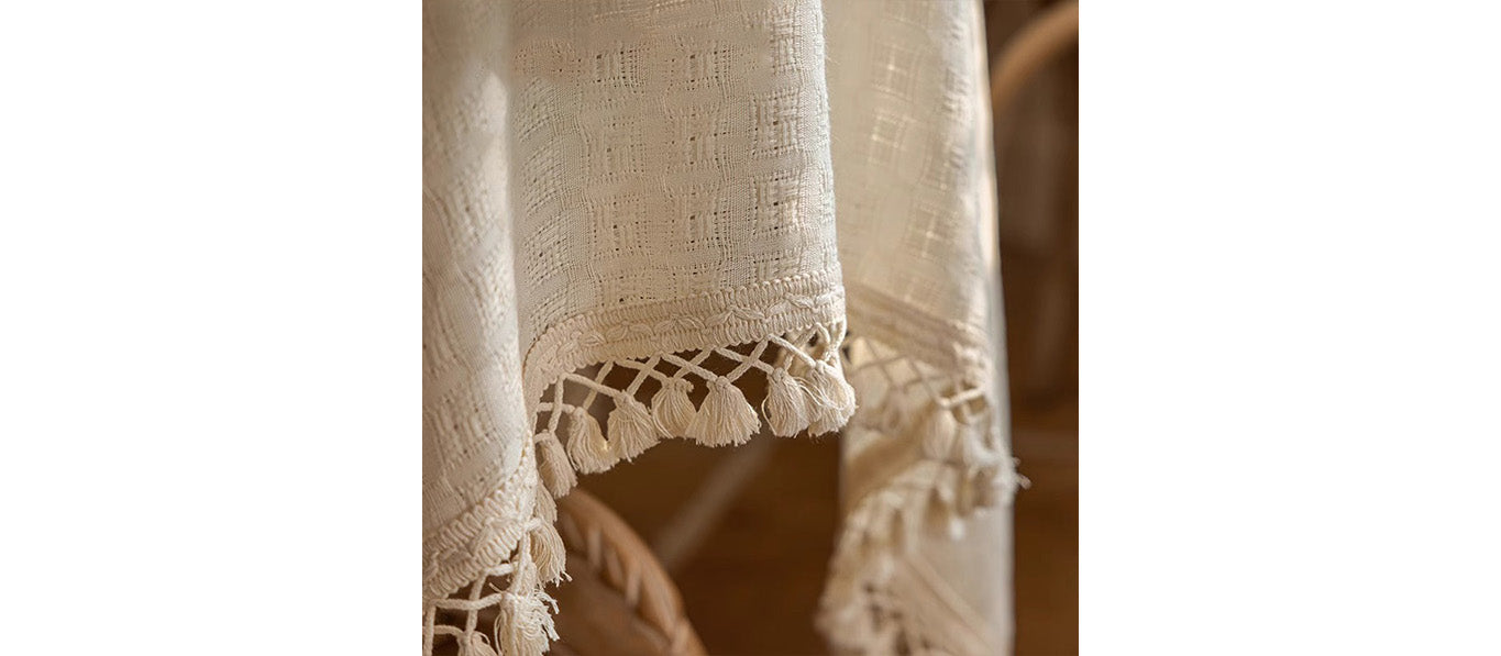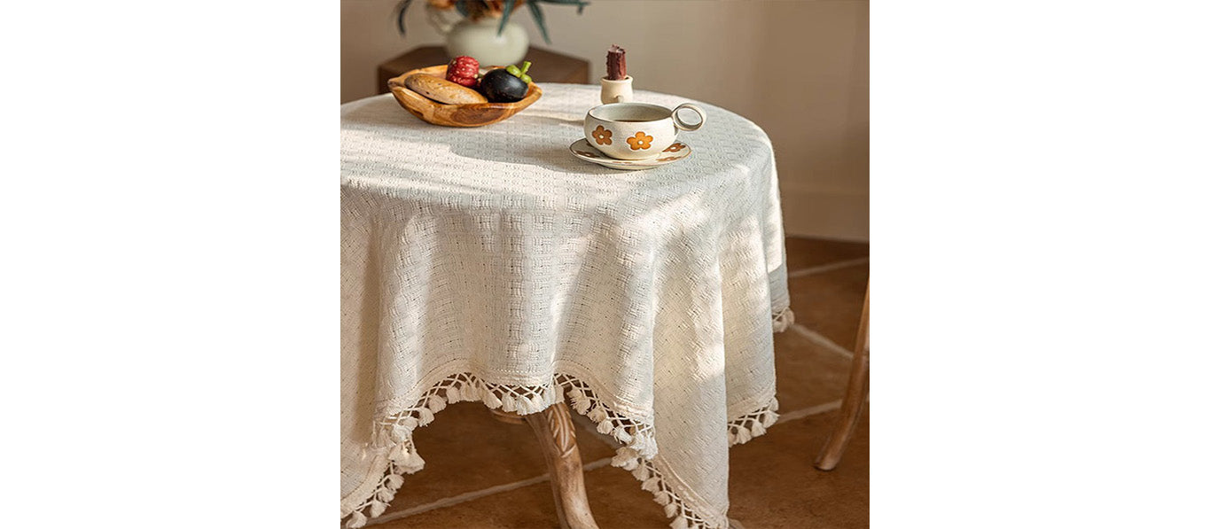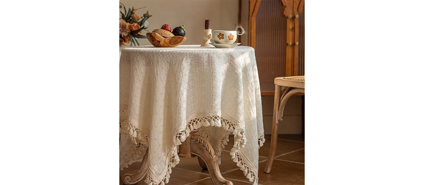 مفرش طاولة باللون البيج، مزين بشراشيب