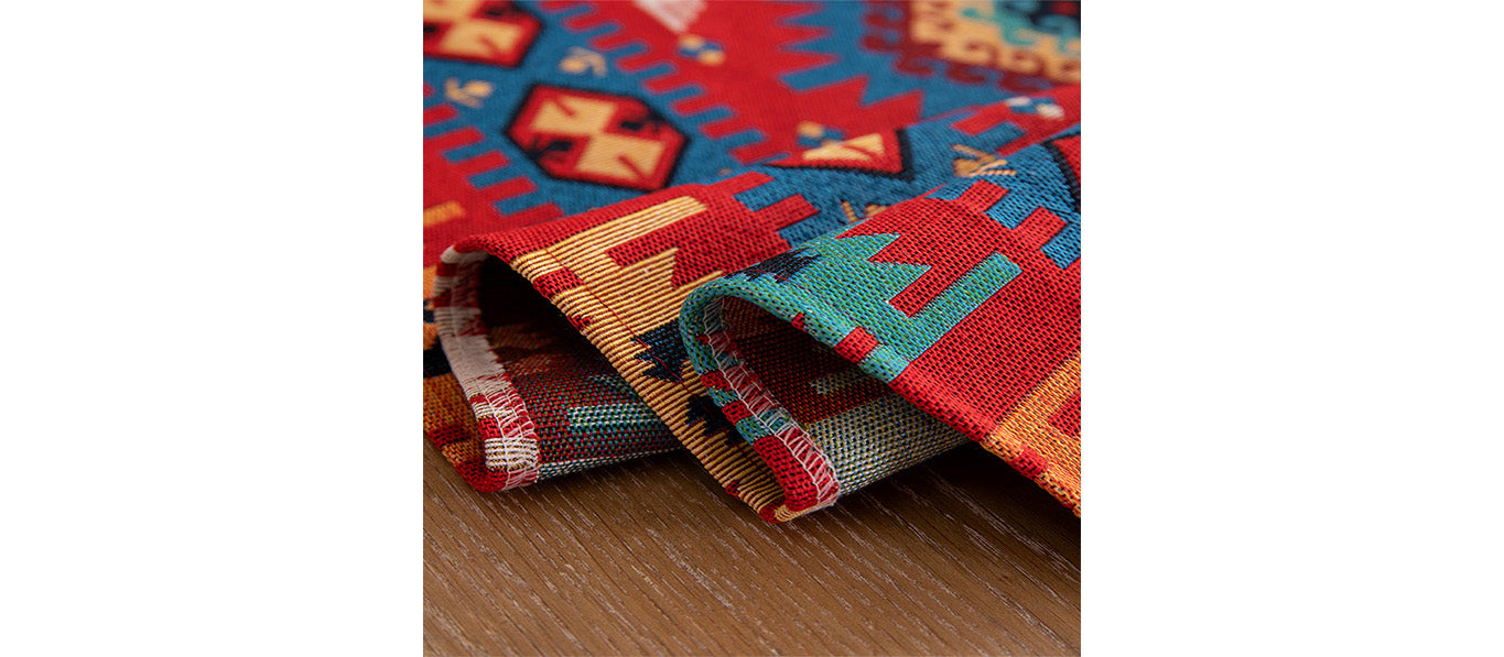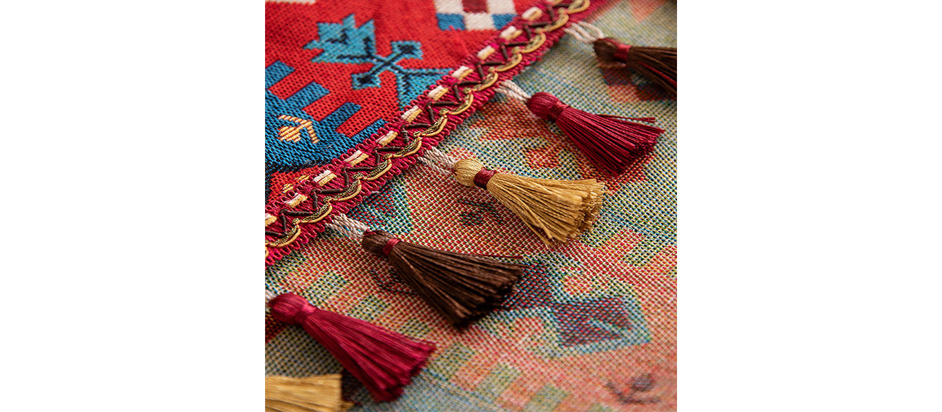 مفرش طاولة مزين بزخارف زهرية بالألوان المائية ومزين بشراشيب وحواف مزينة بشراشيب