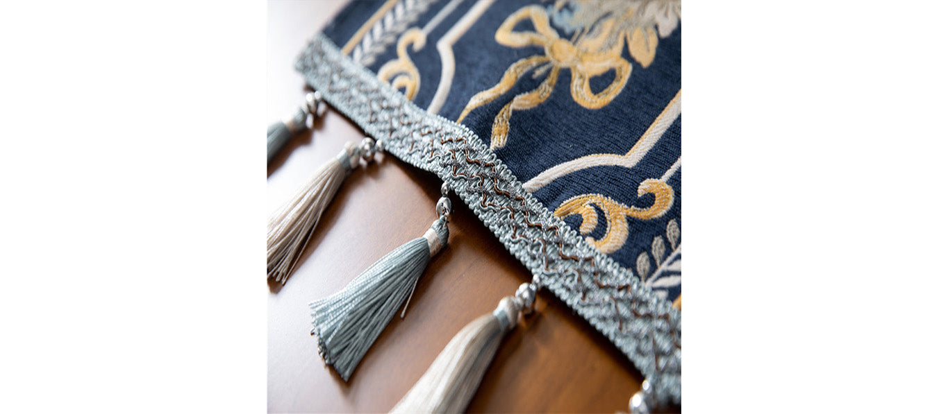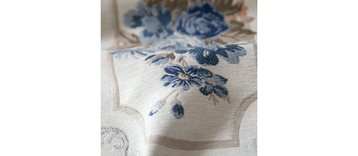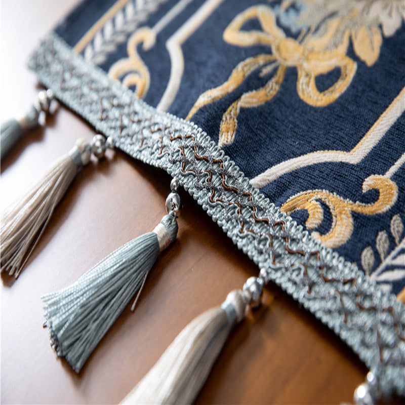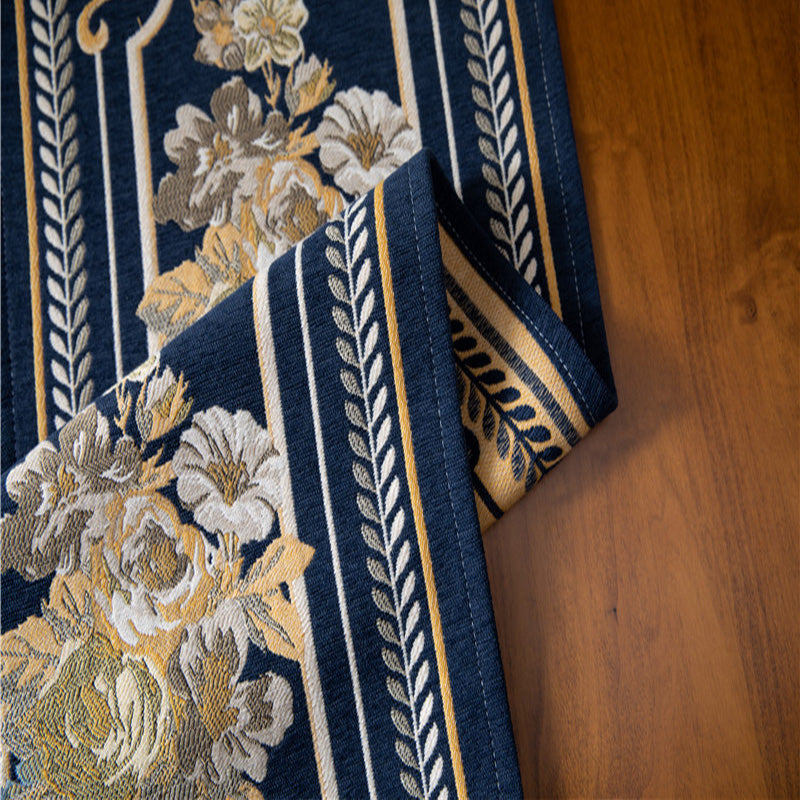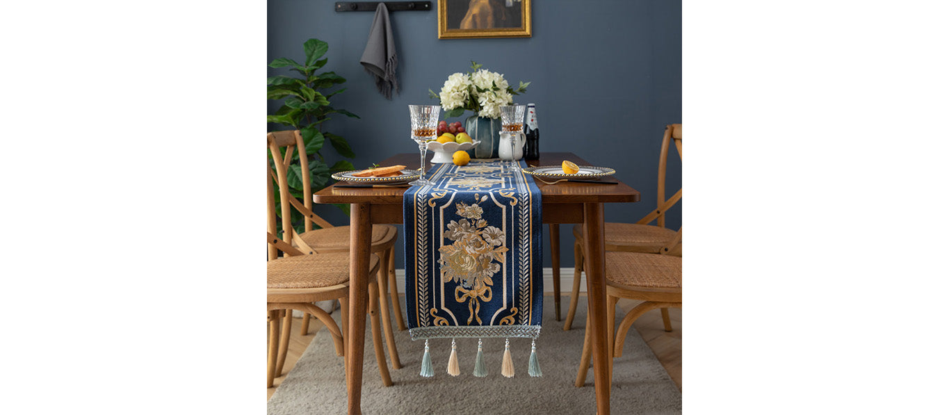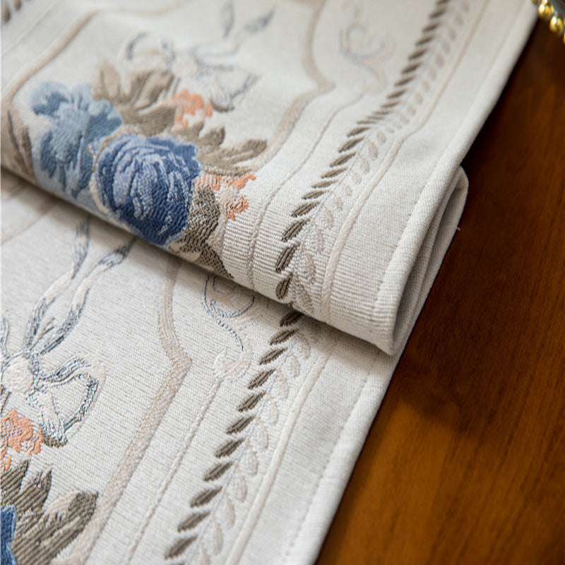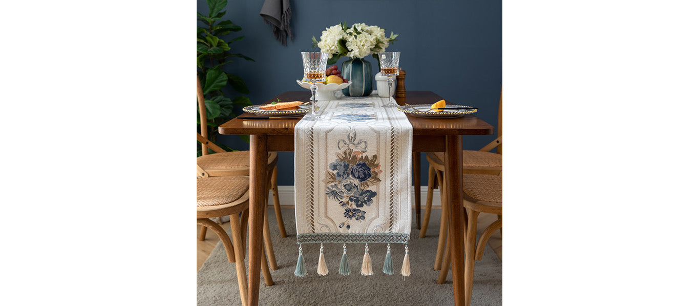 مفرش طاولة كلاسيكي أبيض وأزرق مطرز مفرش طاولة طعام أنيق من الجاكار