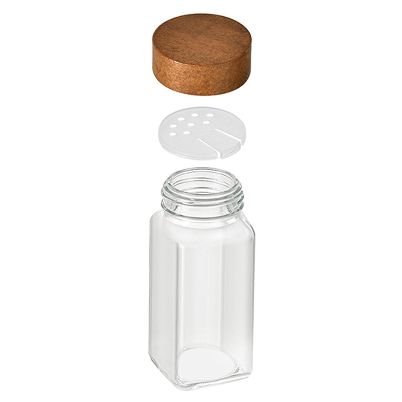 وعاء توابل مربع الشكل، وعاء فلفل أسود من خشب الصنوبر، وعاء توابل زجاجي.